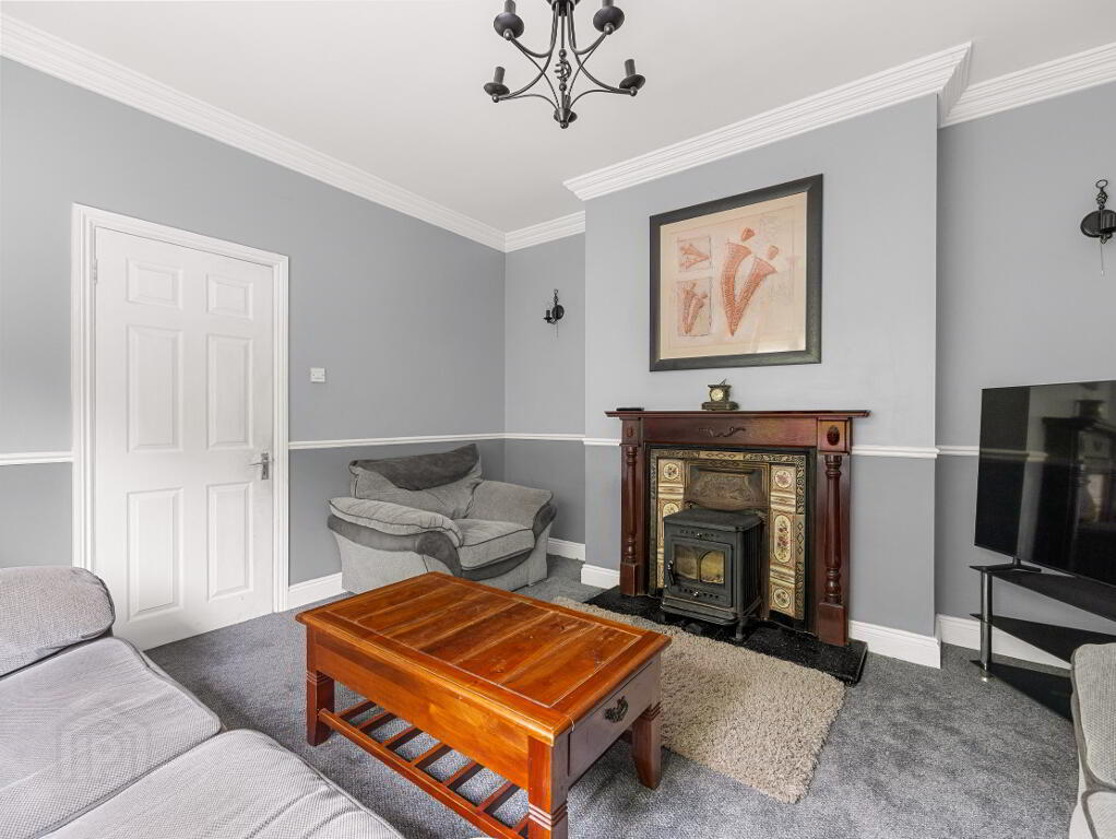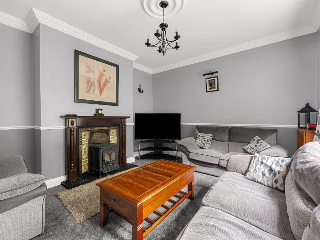 Living Room (4.2m x 3.8m) – Cast iron fireplace with timber surround, ceiling coving and centrepiece.