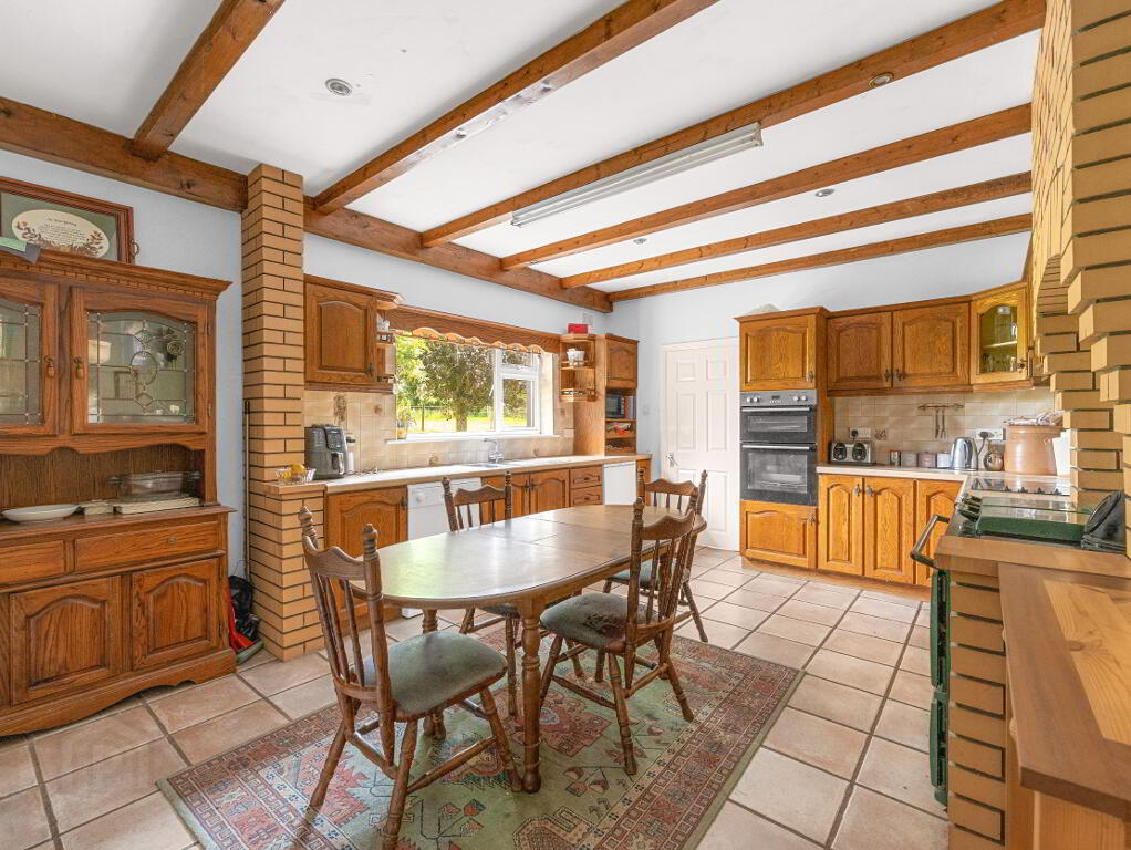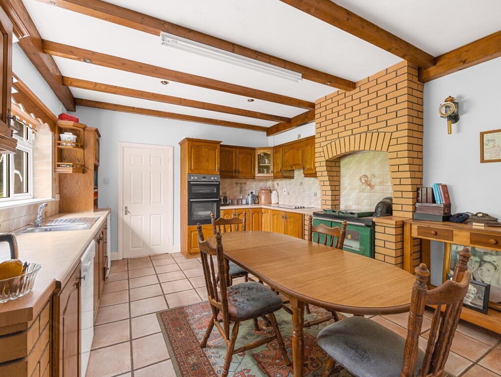 Kitchen/Dining Area (3.8m x 5.1m) – Fully fitted wall and floor units, beam ceiling, tiled floor, and Stanley oil-fired cooker with brick surround.