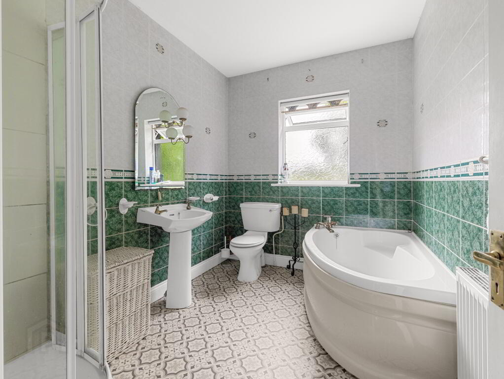 Family Bathroom (2.1m x 3.0m) – Fully tiled with corner bath, shower, WC and WHB.