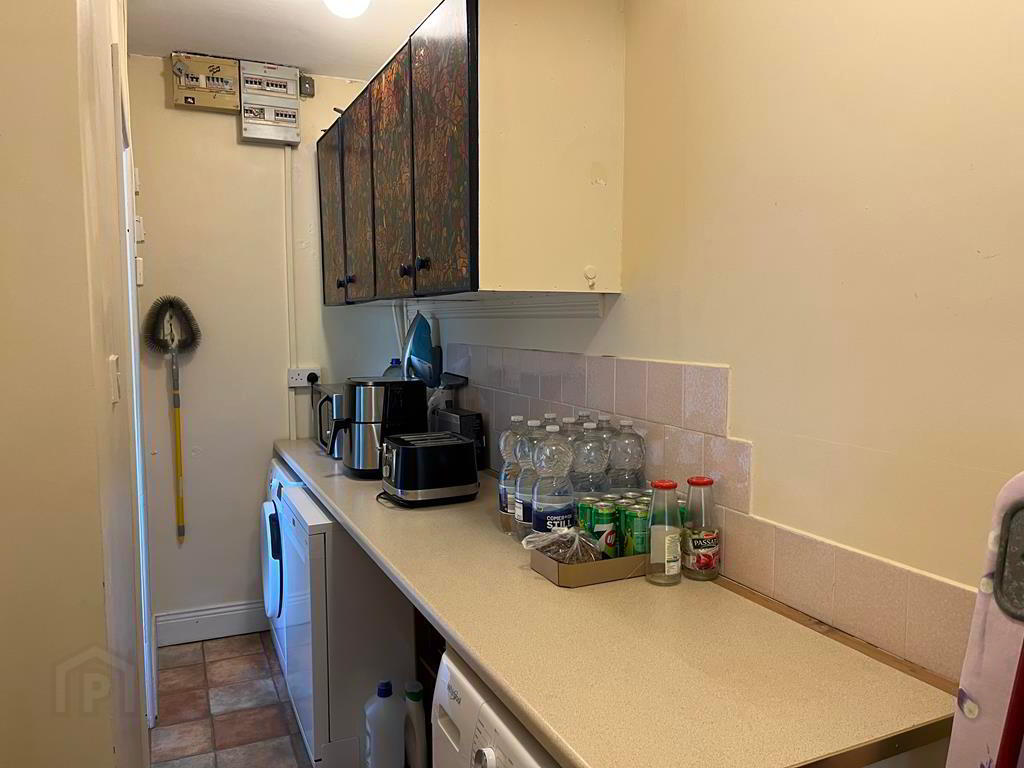 4.50m x 1.13m Wall units, counter top, tiled floor and splashback, plumbed for washing machine, dryer and dishwasher, door to rear.