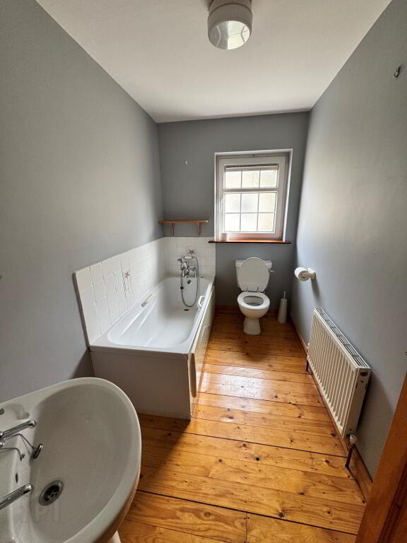 Bathroom: (3m x 1.7m) Wooden floor, Bath, whb, wc