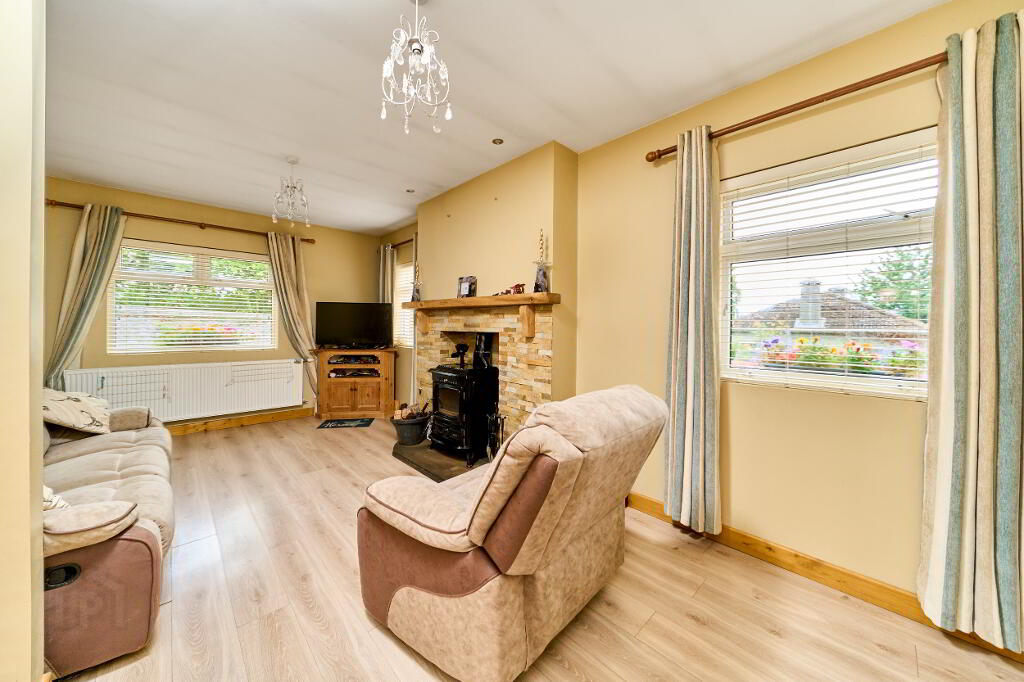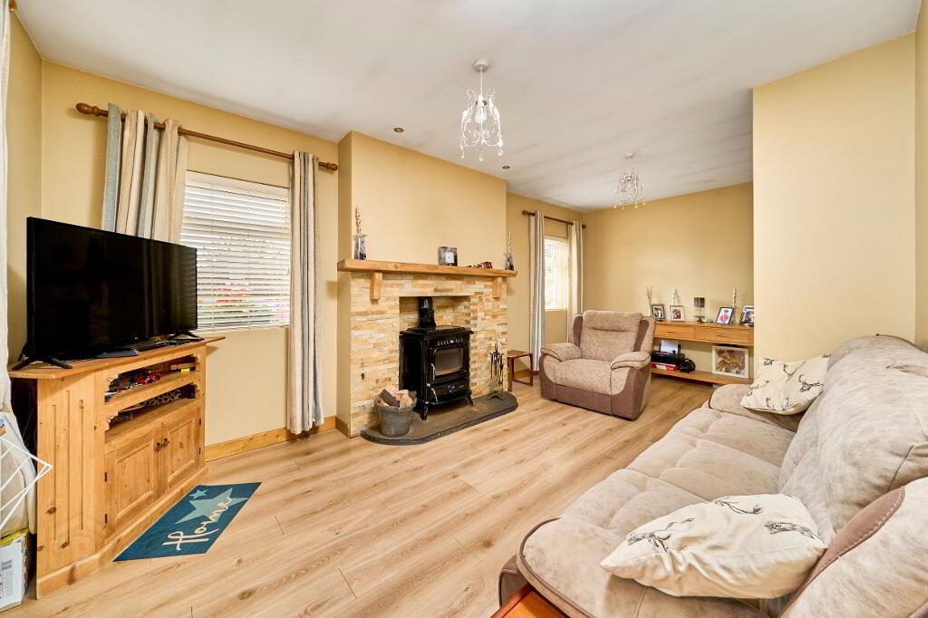 The hallway continues and to left a generous family living room, made snug and cosy with the addition of a solid fuel burning stove, statement piece surround and mantel.
