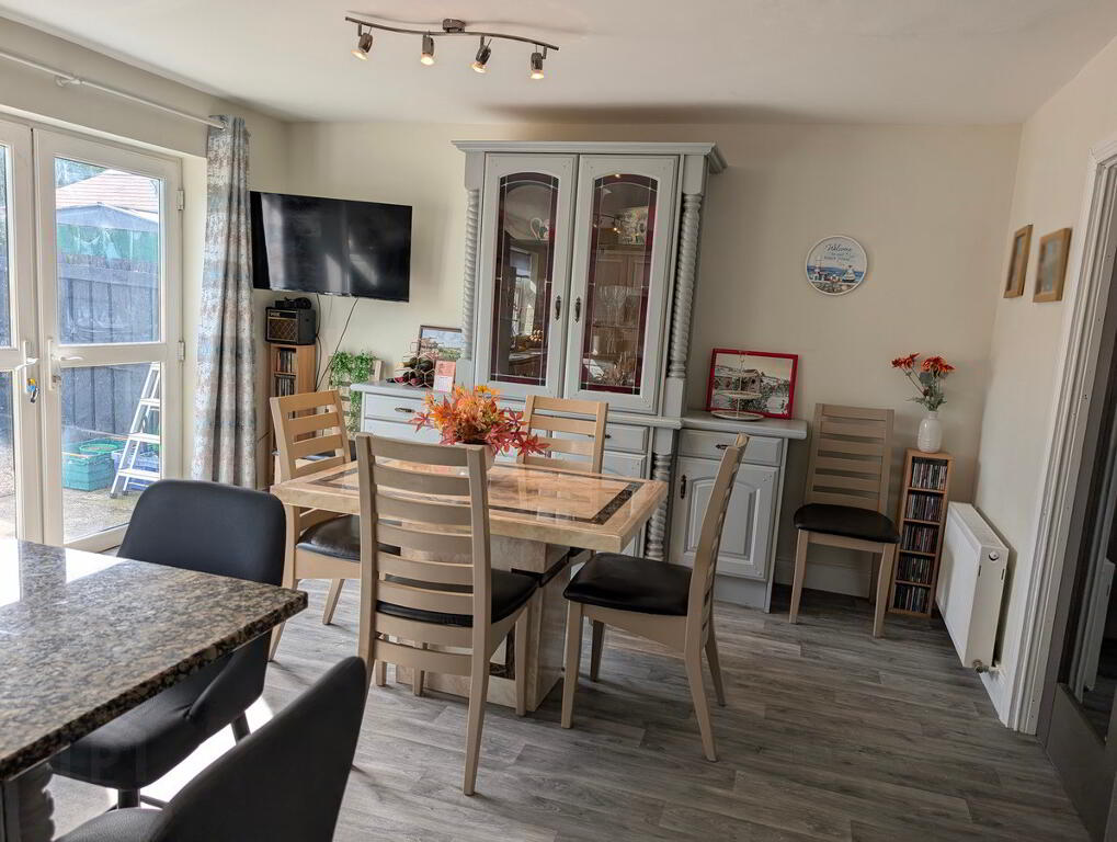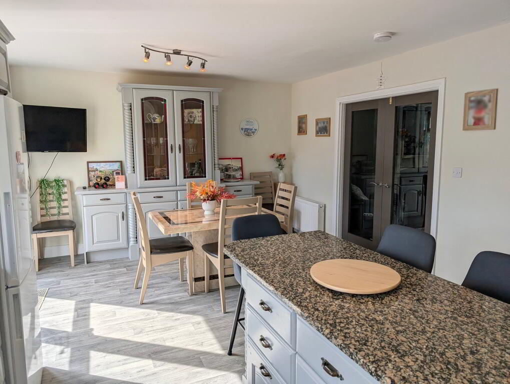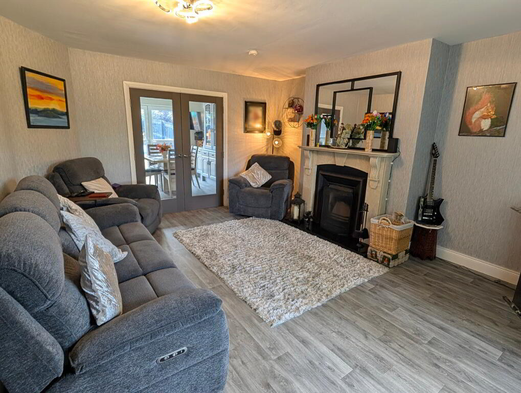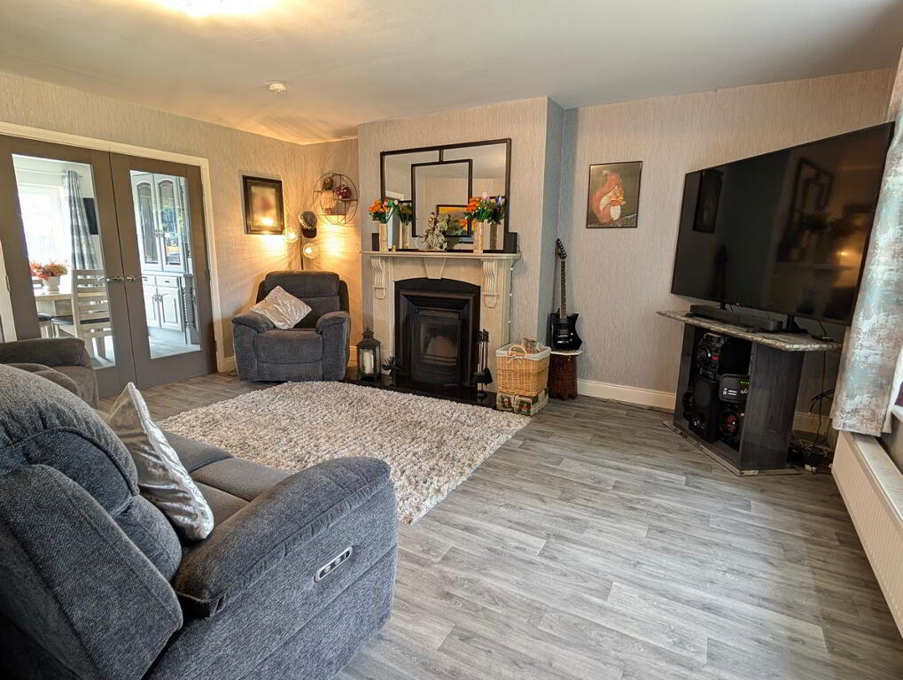 Sitting Room (5.2 x 4.1) with open fireplace & double doors leading to Kitchen/diner (4.1 x 6.2) with patio doors to the rear garden.