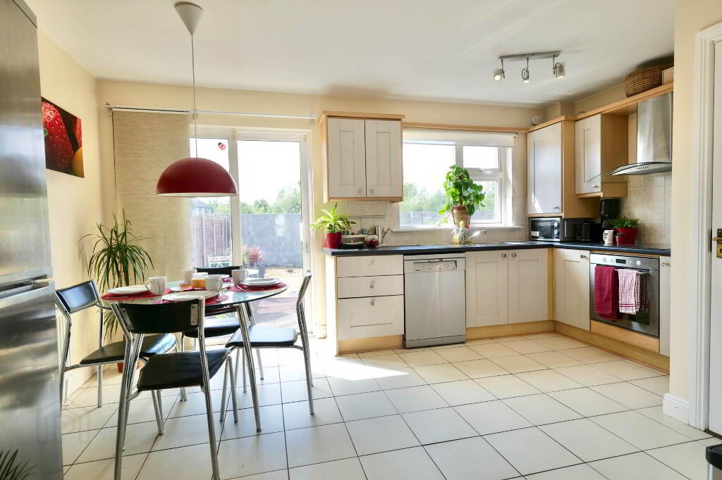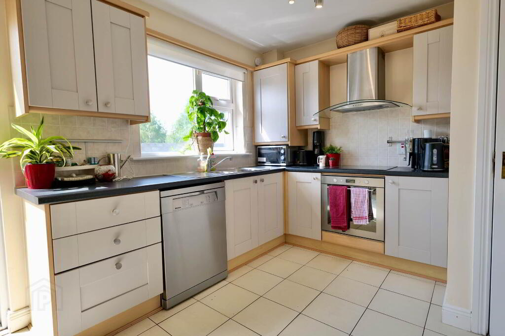 Fully fitted kitchen, tiled floor, sliding doors to large decking area in rear garden, all kitchen appliances included in sale