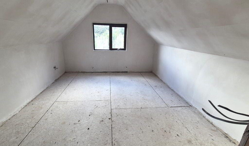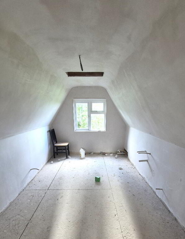 The challenges lay with the need for a sewerage system – planning permission will be required. The new 1st fix wiring will need to be certified, and electricity reconnected. The unfinished refurbishment works included double glazed windows and a completely new roof structure, but did not reach to installing the central heating system. So, the property is not immediately liveable, BUT, what you will have, is an excellent structure with interesting room sizes, eaved ceilings and a setting to die for.