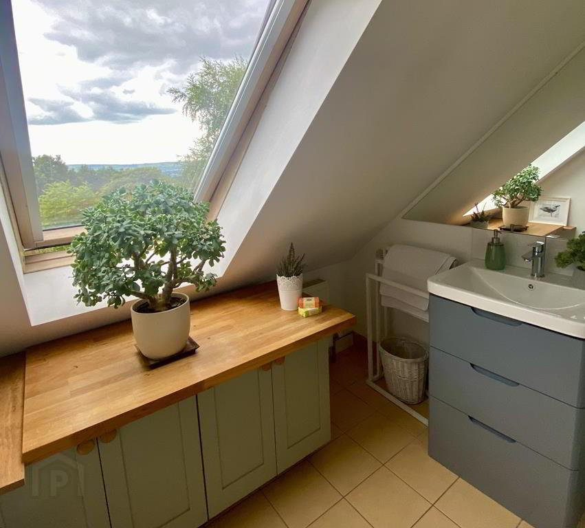 2.00m x 2.48m Tiled floor and shower enclosure, vanity unit, built in bathroom storage, velux window.
