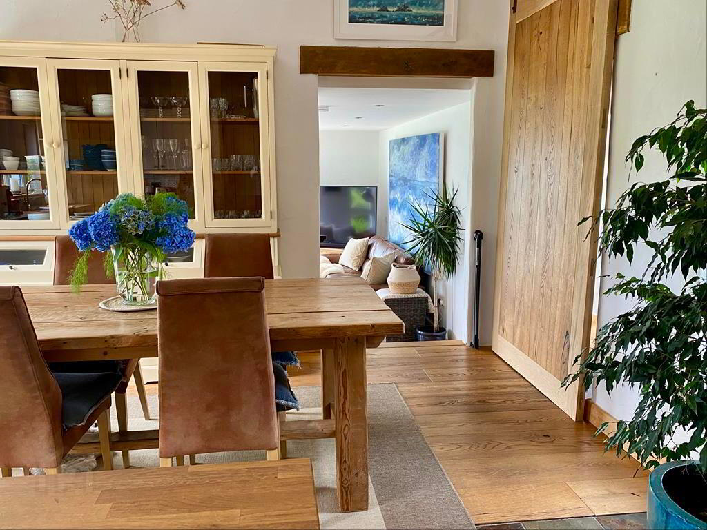 6.05m x 4.89m Open plan, hand-painted fitted kitchen units exuding timeless charm, oak worktops, high-quality Bosch appliances, including a double eye-level oven, extractor and integrated dishwasher, ensure both style and functionality, island unit, complemented by a practical pantry unit.