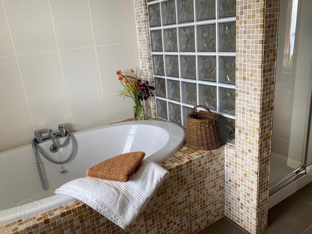 3.26m x 2.52m Vanity Unit, with overhead mirror with lights, tiled floor and walls, mosaic tiling to bath and shower area, power shower, window provides for natural ventilation, extractor