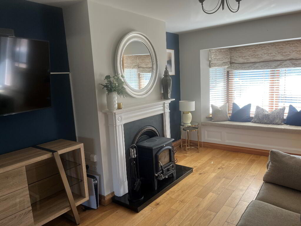 Sitting Room: (5.5m x 3.2m) Oak floor, Feature fireplace with solid fuel stove, Bay Window
