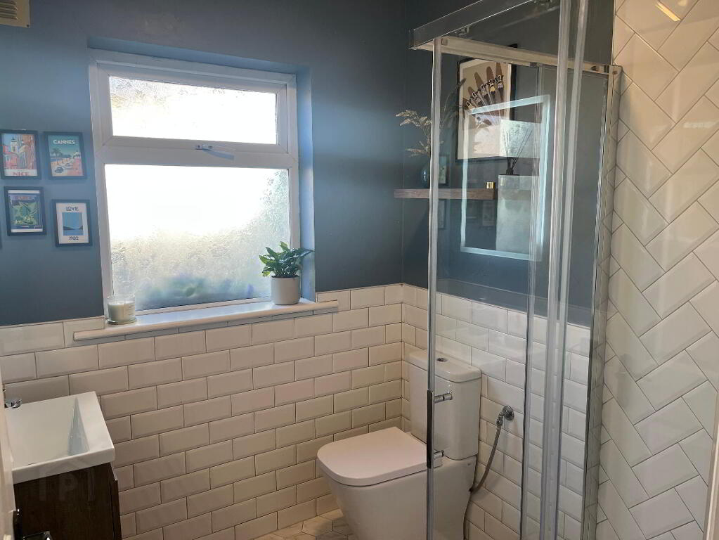 1.92m x 1.84m Tiled floor and partial tiling to walls, vanity unit, with lighted mirror overhead, fully tiled shower enclosure, Triton T90sr electric shower, extractor, window provides for natural ventilation.