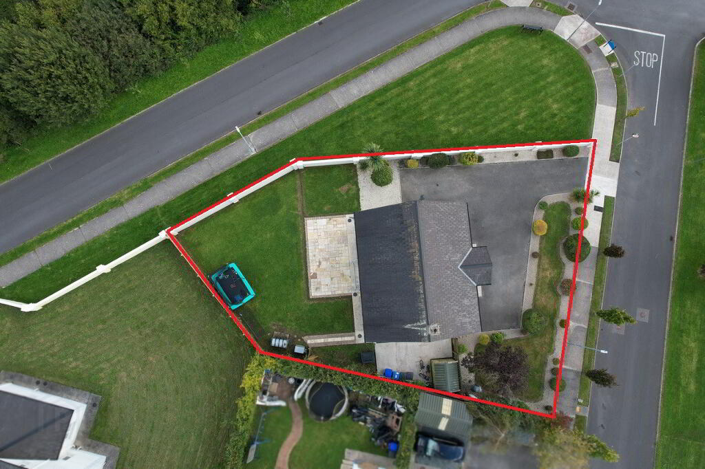 The clearly bounded corner lot is landscaped & exceptionally well maintained & affords ample off-street parking on the tarmacadam driveway bordered by flower beds & shrubbery. To the rear is a paved patio area & large lawn, this leads to a concreted side area with garden shed (6’ x 8’) & fuel store.