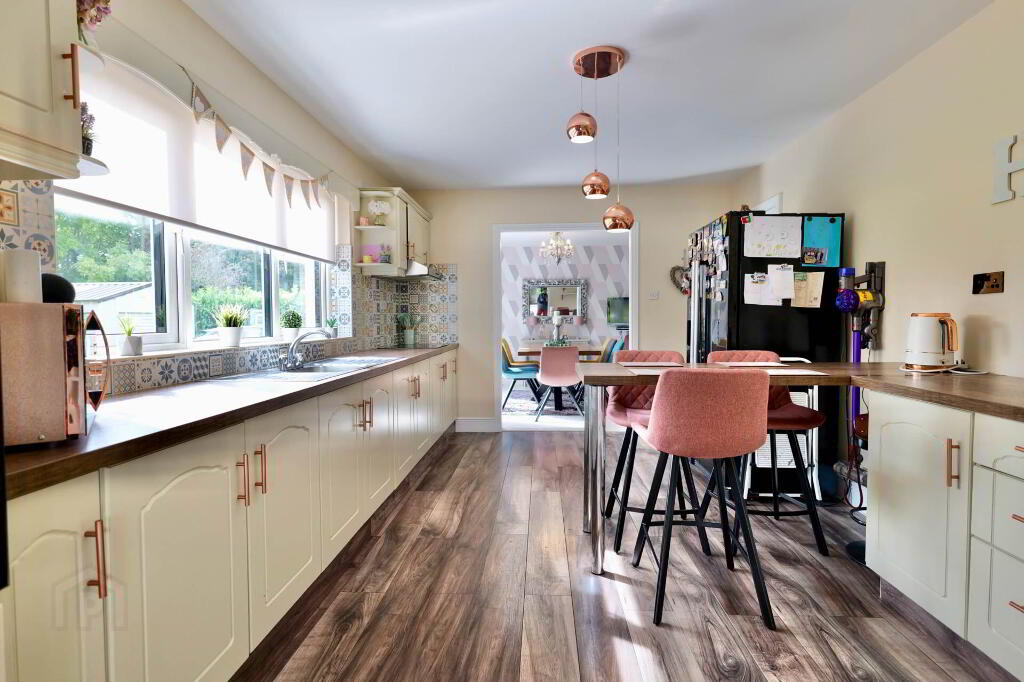 Fitted kitchen, Breakfast bar, Integrated appliances, Tiled splash back, Laminate flooring