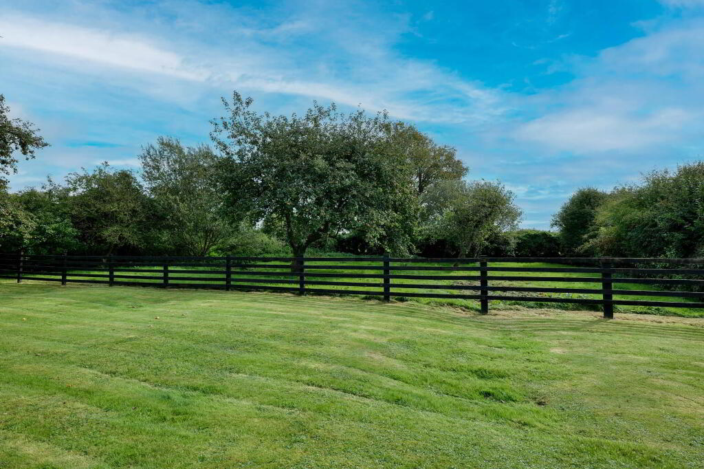 Behind a private stone walled gated entrance, the home is surrounded by mature trees and shrubbery including apple trees, hedging, and secure boundary fencing, offering both privacy and tranquillity.