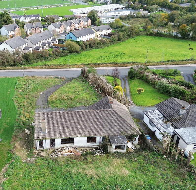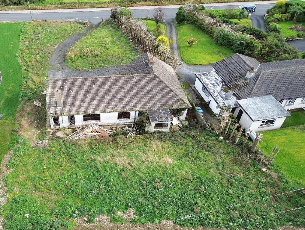 A disused bungalow residence with integrated garage on wonderful site with panoramic views over town, situated off the Carrickmacross road, 400m from the centre of town, convenient to schools and all amenities.