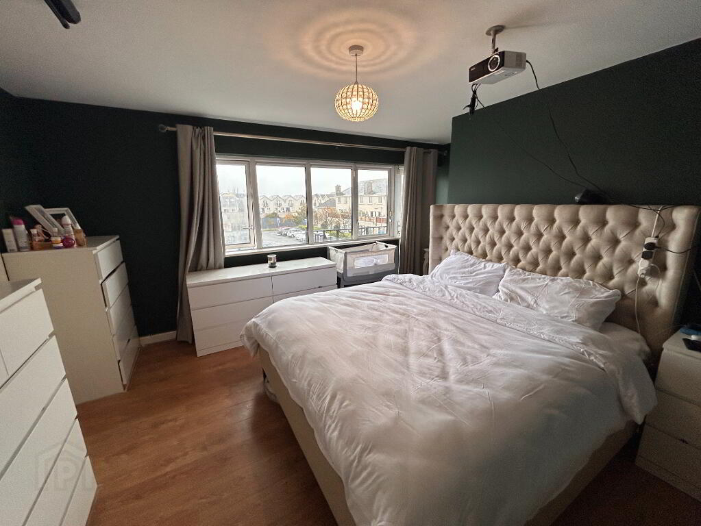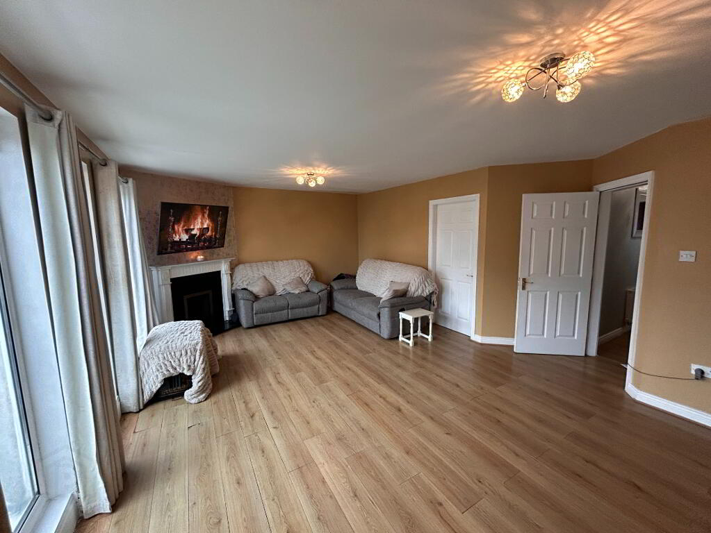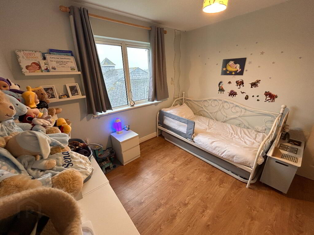 Upstairs, there are three generously sized double bedrooms, including a master with fully tiled en-suite and its own private balcony boasting a view of the sea. The family bathroom features a shower-over-bath, while a shelved hot press provides excellent additional storage.