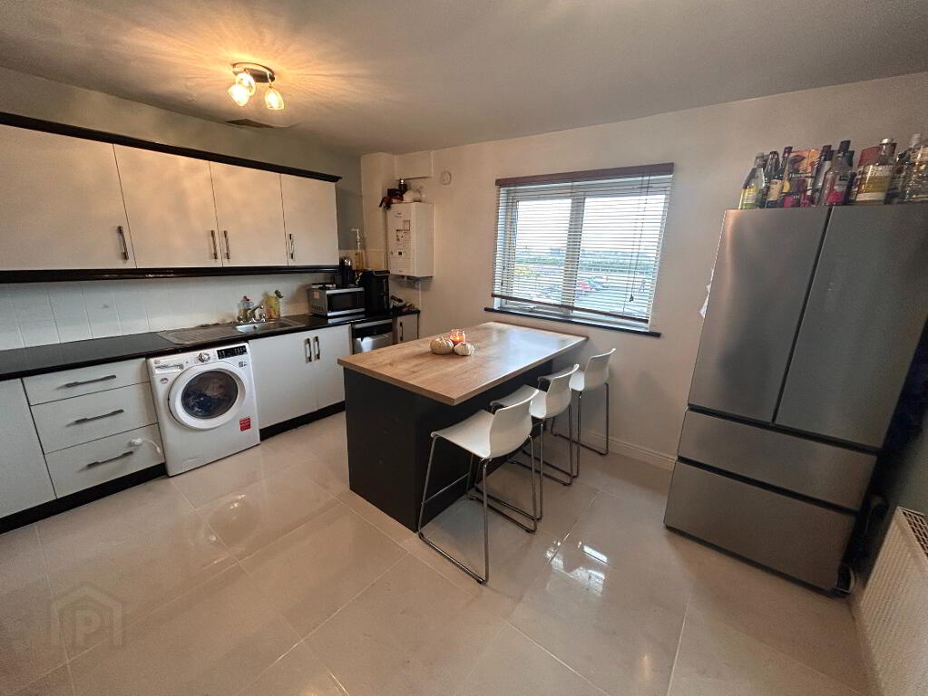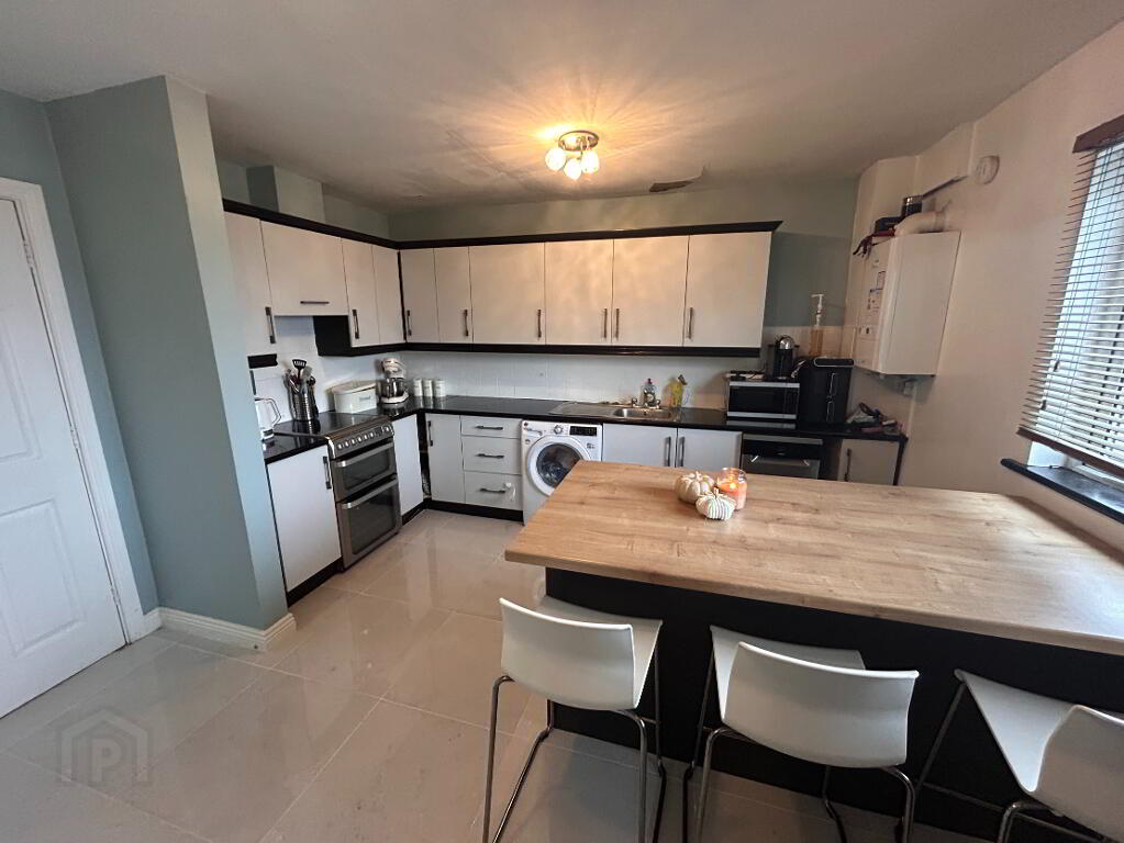 Eat-in Kitchen: 4.1m x 3.82m Tiled floor, island, range of floor and wall units, tiled splashback. Oven, hob and fan. Plumbed for washing machine and dish washer.