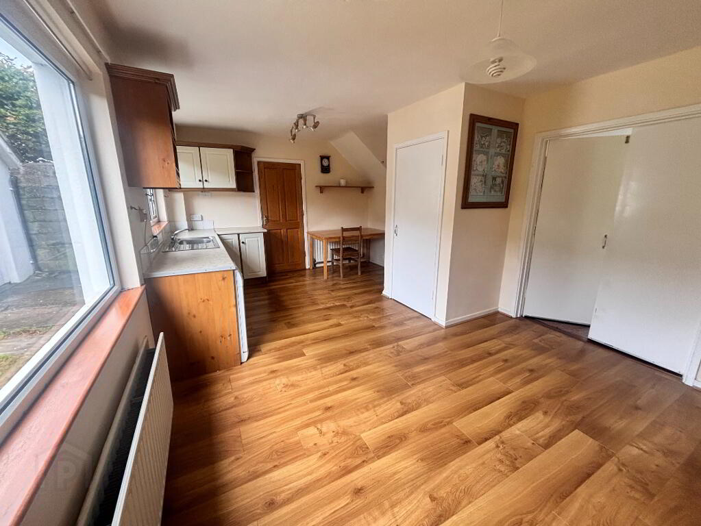 6.11 m x 3.46 m. Open plan Kitchen/Dinning with fitted units, laminated floor. Hidden pantry and stone design open fireplace