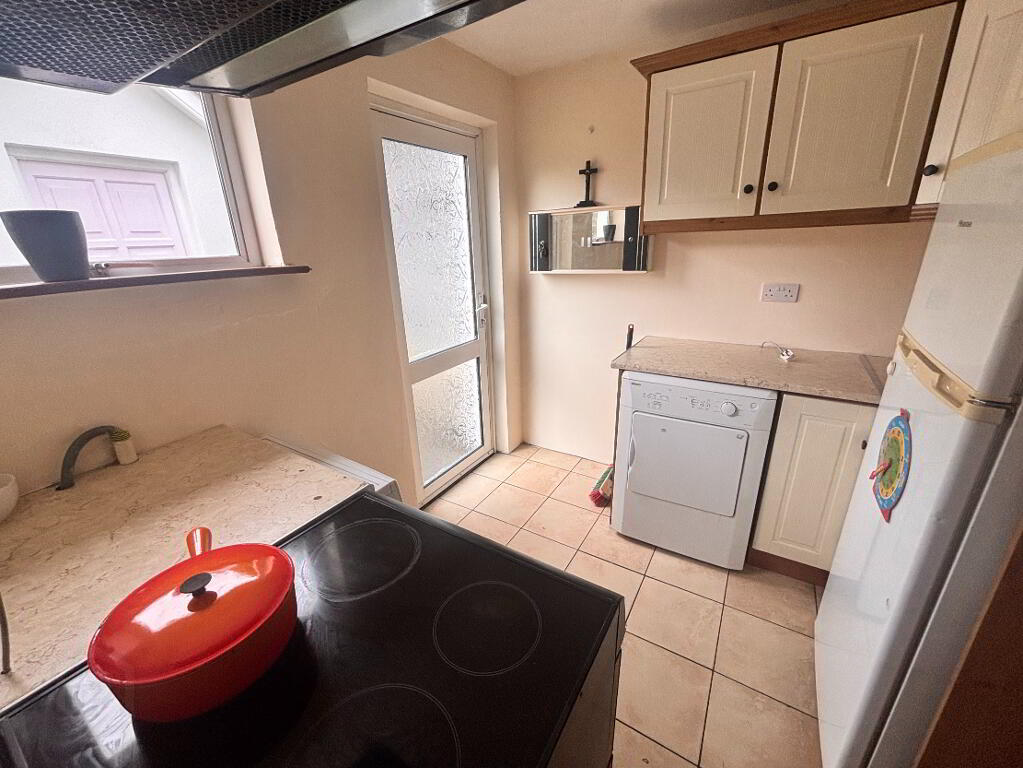 2.40 m x 2.27 m. Utility with countertop, tiled floor and door to rear