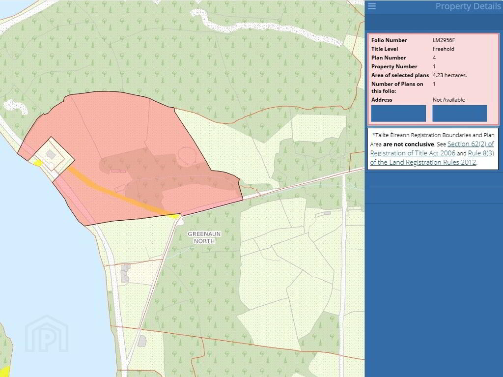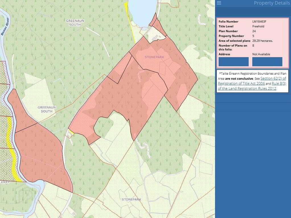 Folio LM2269; 26.64 ha/65.83 acres & Folio LM18463F; 29.29 ha/72.37 acres. This latter folio has C. 20.36 ha/50.31 acres directly adjoining LM2269 with the remaining C. 8.93 ha/22.07 acres parcel being under conifer plantation.