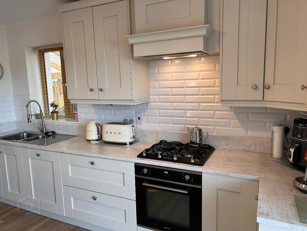 The heart of the home lies in the impressive open-plan kitchen and dining area, designed with both style and functionality in mind. Featuring a large central island, gas hob, Smeg oven, and plumbing for an American-style fridge freezer, this space is perfect for modern family living. The adjoining utility room is plumbed for a washing machine, and includes a sink and fitted units, with a back door leading to a covered lean-to—ideal for extra storage.