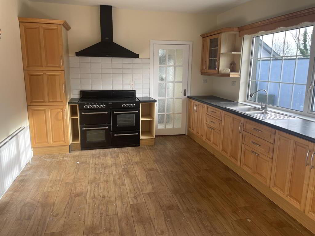 6.96m x 3.63m Floor and eye level units, Belling range, Extractor, patio doors, Open fire, hotpress off, utility off
