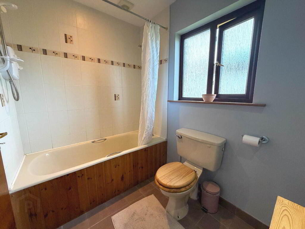 WC, WHB, Electric shower, Bath, Heated towel rail, Tiled floor and part tiled wall