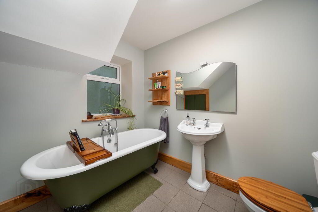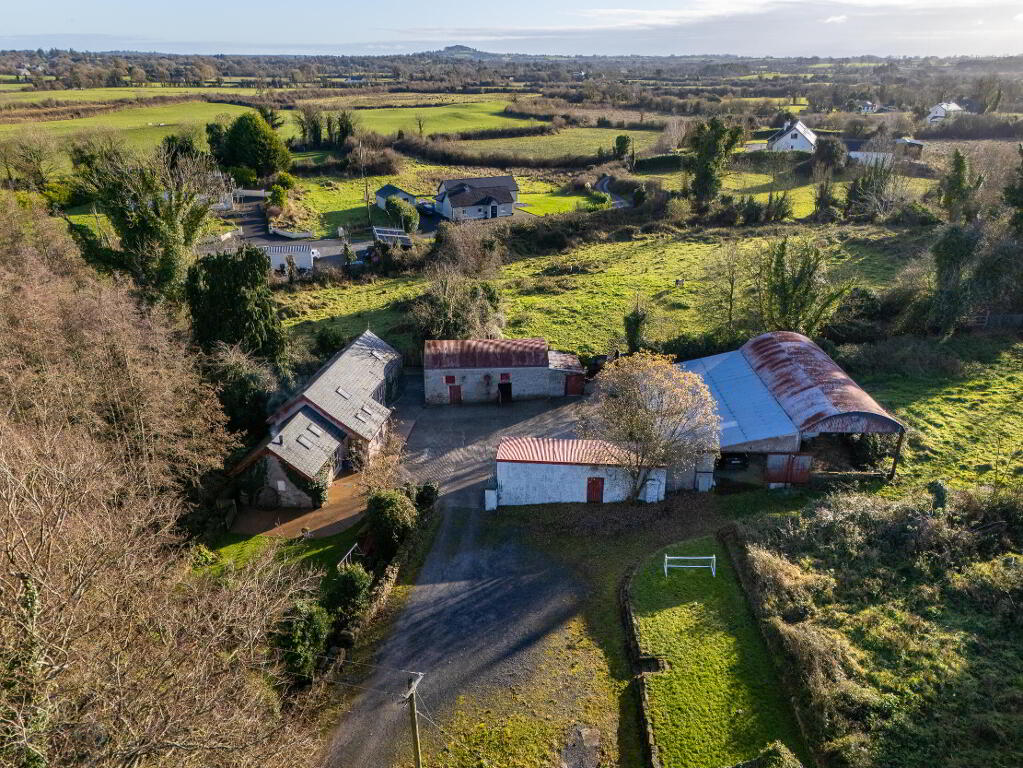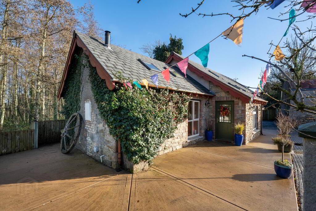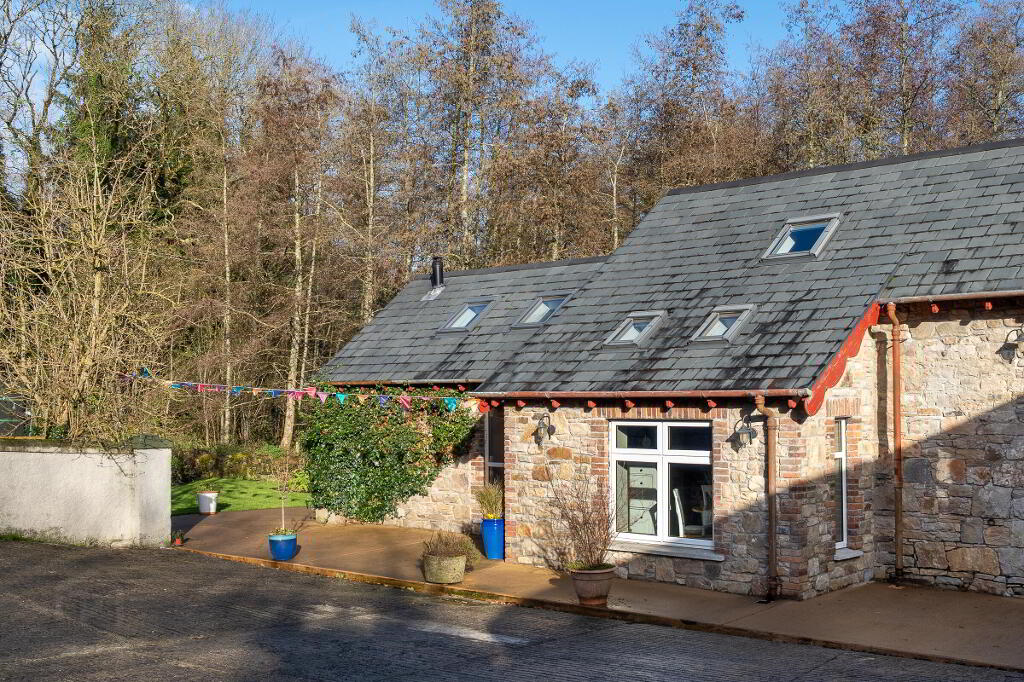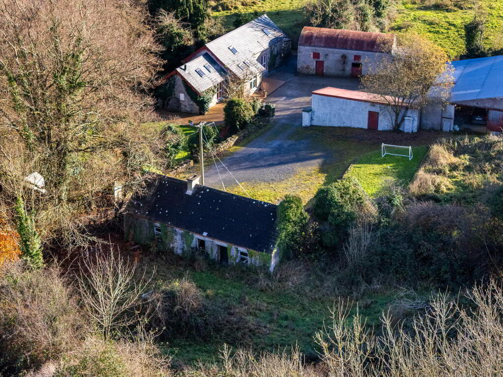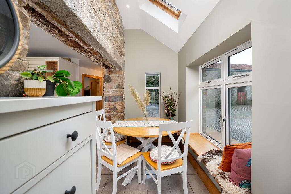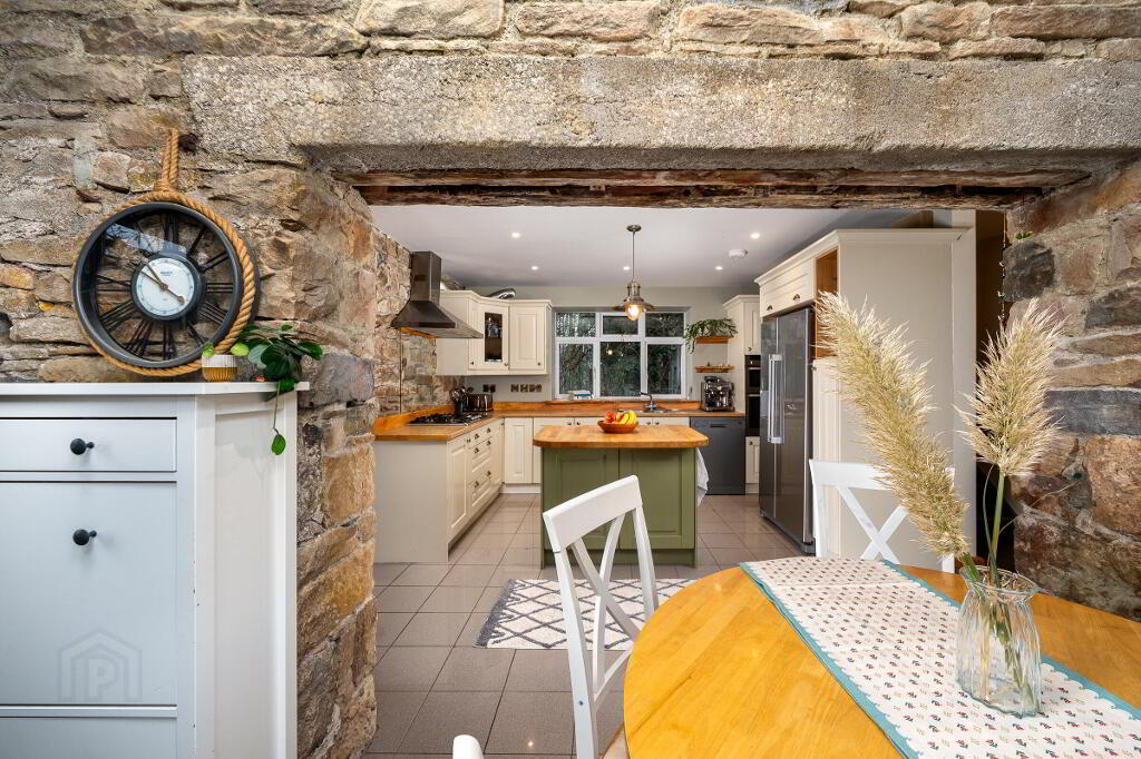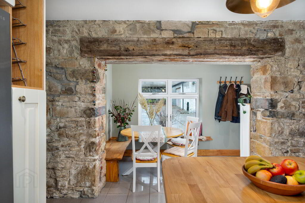 Step into the charm of countryside living with this beautifully refurbished stone-cut cottage, set amid c. 3.03 acres of lush, chemical-free land. Every inch of this residence has been lovingly restored, preserving its heritage while offering modern comfort in an enchanting rural setting. Inside, the heart of the home is the stunning open-plan kitchen/dining room, where original cut-stone walls, timber-beamed ceilings, and a deep-set window frame the woodland backdrop beautifully. This warm, character-filled space comes complete with ample built-in units and a wonderful sense of natural light and texture. The lounge is equally impressive, featuring a dramatic cut-stone feature wall, vaulted ceiling, and a solid-fuel stove with back boiler?perfect for cosy evenings in. The home benefits from oil-fired central heating throughout, with the added luxury of underfloor heating on the ground floor, ensuring comfort all year round. Also on the ground floor is a serene main bedroom with ensuite and walk-in wardrobe, along with a stylish family bathroom. Upstairs, two further bedrooms and a shower room provide ideal accommodation for family or guests. A cleverly converted outbuilding houses the utility room just beside the main residence, keeping daily living practical and efficient.