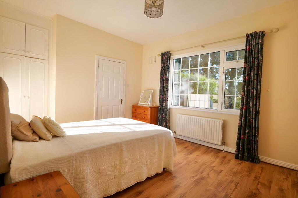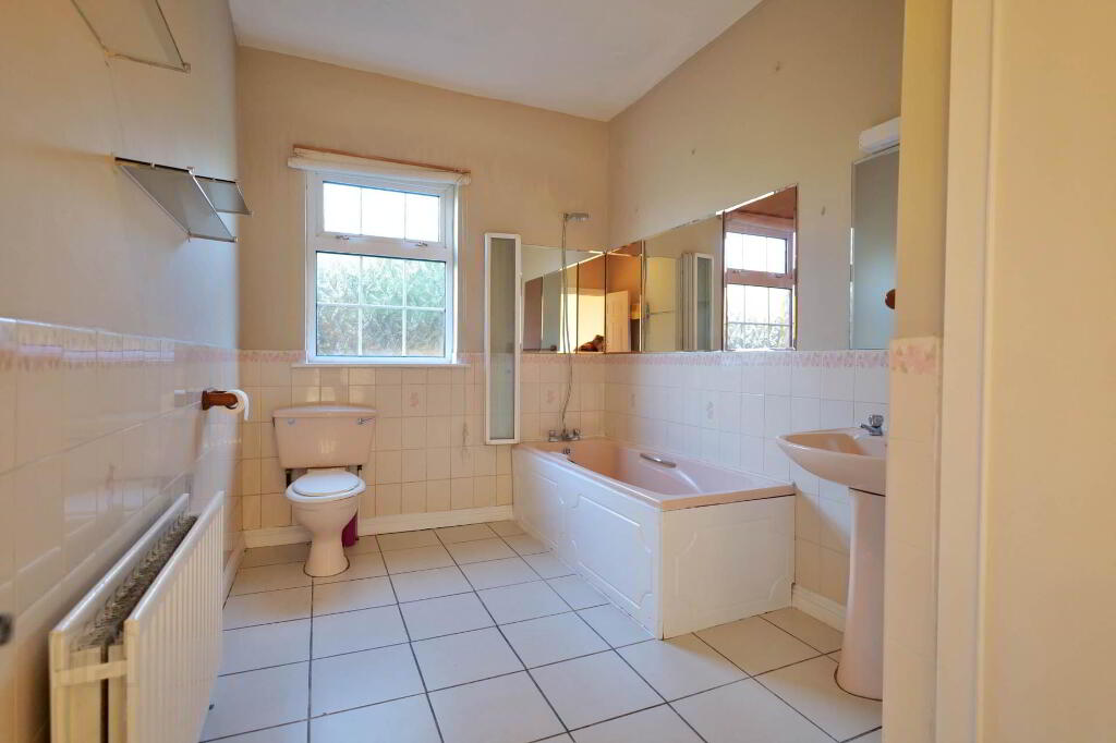 This attractive bungalow, which extends to approx. 132.61 sqm, presents a well-considered layout ideal for modern living. On entering the property, viewers are greeted by a substantial, bright entrance hallway with a timber floor leading through to a spacious sitting room. Here, there is an open fireplace with a marble surround complimented by timber flooring, decorated in neutral tones. There is a second reception room with a timber floor adjoining the kitchen/diner which also has access from the hallway. This room could easily be re purposed as a fifth bedroom, home office or playroom. The kitchen/dining area, which benefits from plenty of natural light, is practical with ample storage units and worktop space, offset by a cream tiled floor and there is access onto the rear patio via a sliding door.
