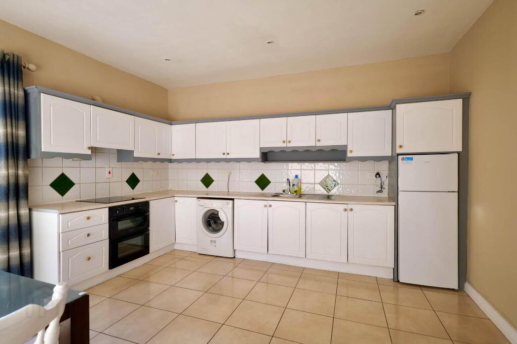 4.7m x 4.3m Tiled floor, tiled splash back, built-in units, power points, integrated double oven and hob, extractor fan, plumbed for washing machine, radiator, sliding door to patio, curtains