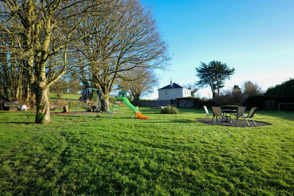The property is accessed by a stone wall to the front of the property with a concrete driveway and features landscaped lawns, mature trees, concrete yard, dog run, large shed, and attached garage. Services include Oil Fired Central Heating, Mains Water and Septic Tank.
