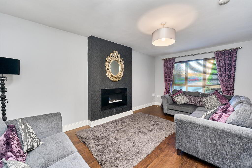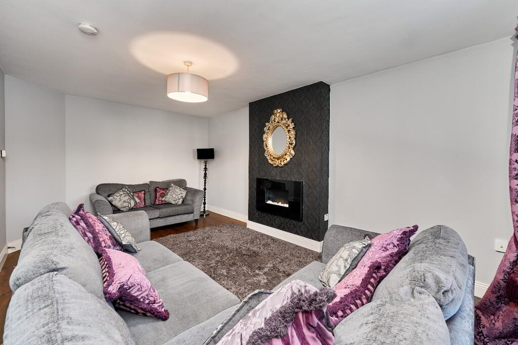 To the right one finds the main family living room, snug and inviting with wall mounted electric fire.