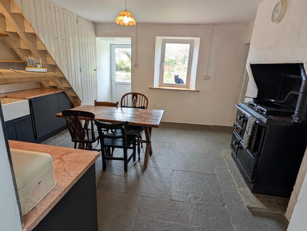Kitchen (4.3 x 4.0) with oil fired range, hot press & enclosed staircase to 1st floor