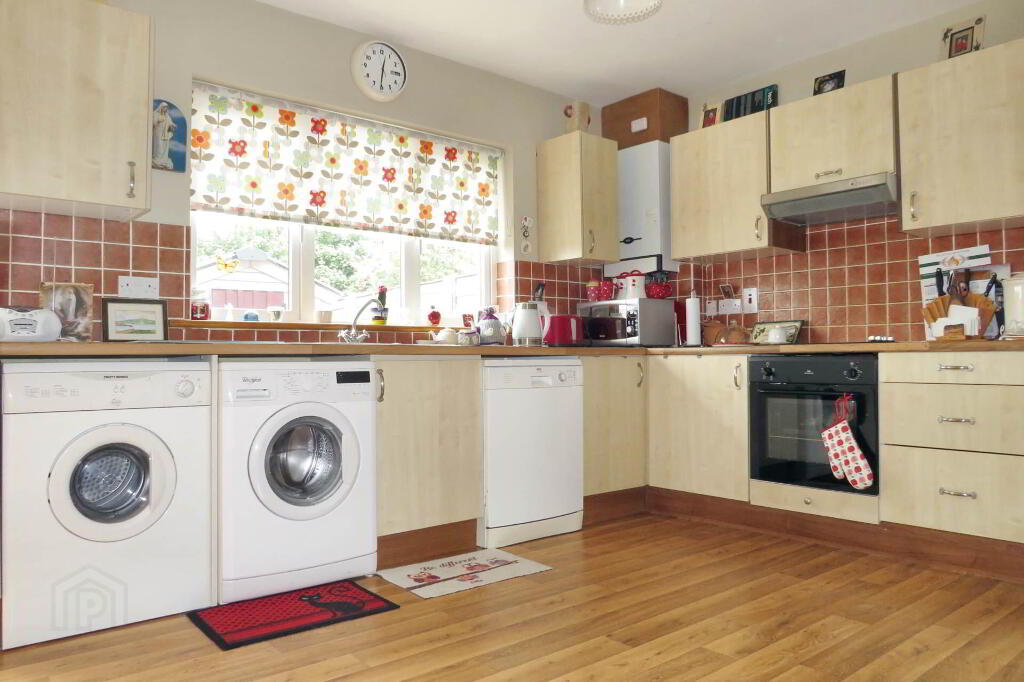 5.86m x 3.98m Built-in units, tiled splash back, timber floor, power points, TV point, radiator, integrated single oven and hob, extractor, plumbed for washing machine, dryer and dishwasher, access to rear garden