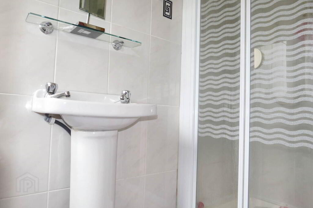 2.85m x 0.80m Tiled floor, tiled wall to wall, wc, whb, electric shower, extractor, radiator, electric shaving light