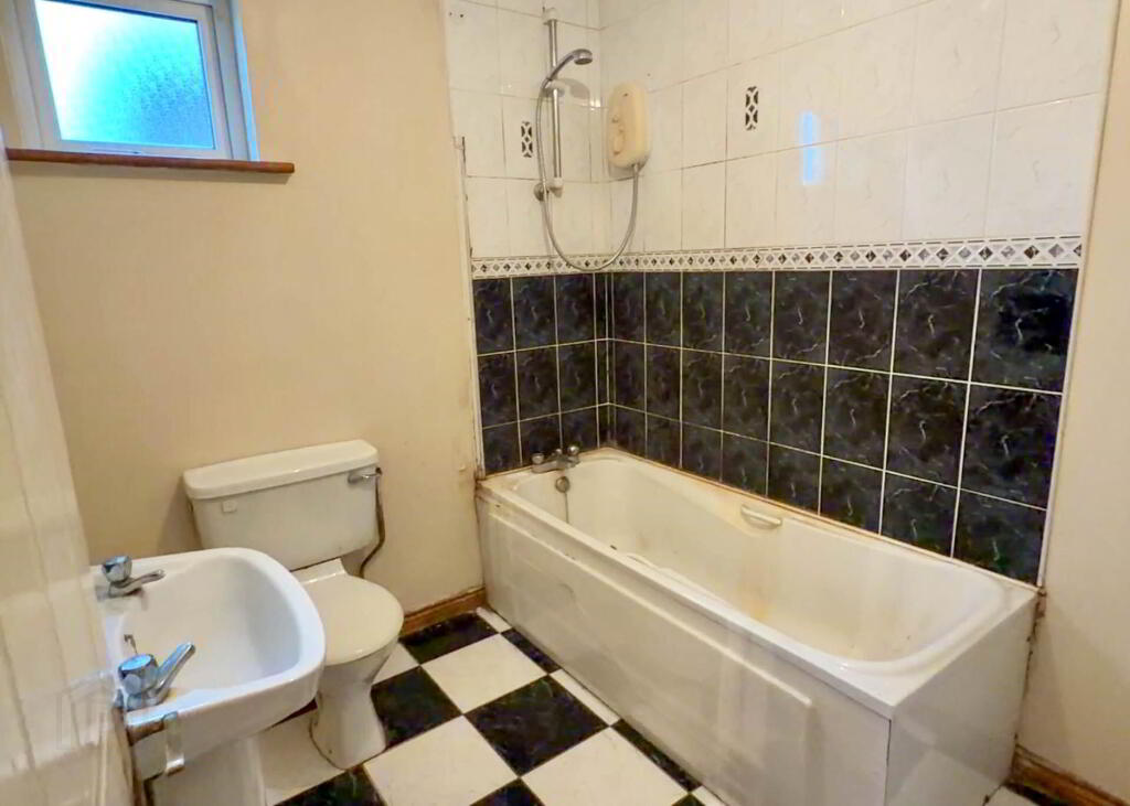 WC, WHB, bath with electric shower, part tiled walls and tiled floor