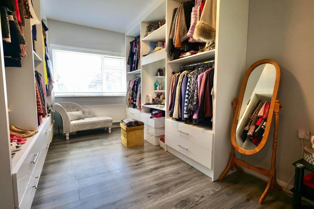 The three bedrooms are all generous, each with timber floors and built-in wardrobes. One of the rooms is currently laid out as a dressing room with wall-to-wall built-in wardrobes. The primary shower room is fully tiled complete with a large shower cubicle and electric shower.