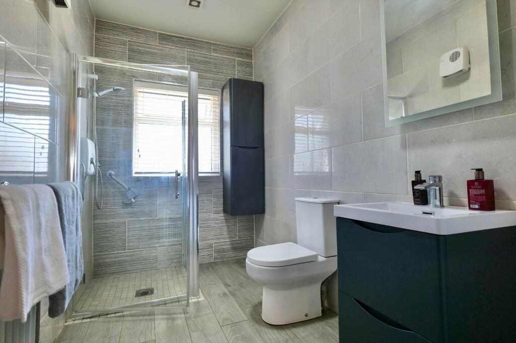 3.9 m x 1.75 m Fully tiled, WC, whb, electric shower, LED mirror, electric heater, radiator, Vanity unit, tall boy, blinds, extractor