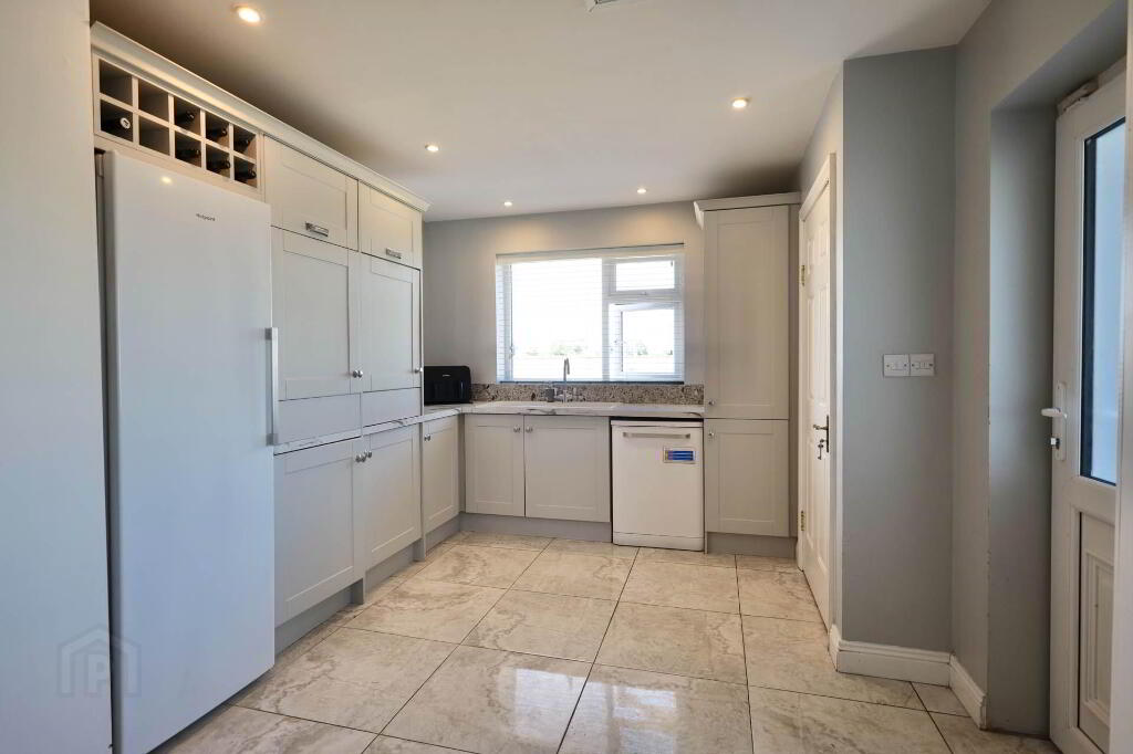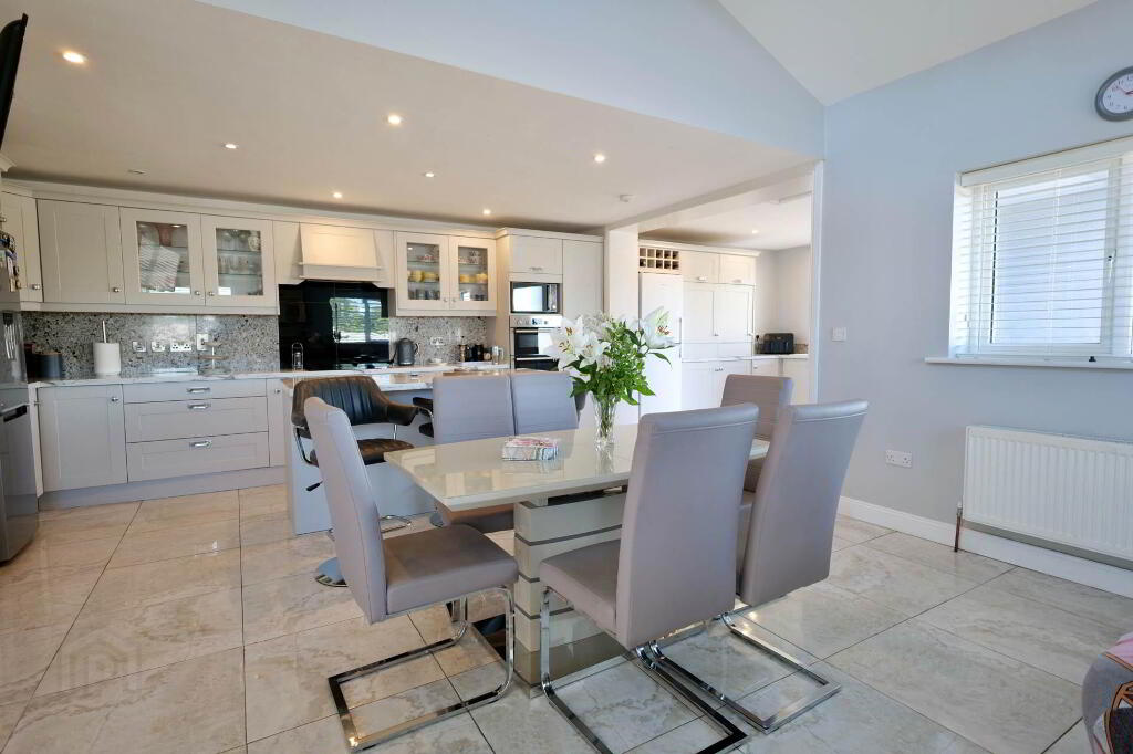 6.2 m x 4.4 m, 3.5 m x 3.2 m Fully tiled, centre island, extensive fitted kitchen with an abundance of storage units, integrated double oven, hob, extractor hood, power points, TV point, recessed lighting, tiled splash back, plumbed for washing machine, dryer and dishwasher, blinds, radiator, access to rear