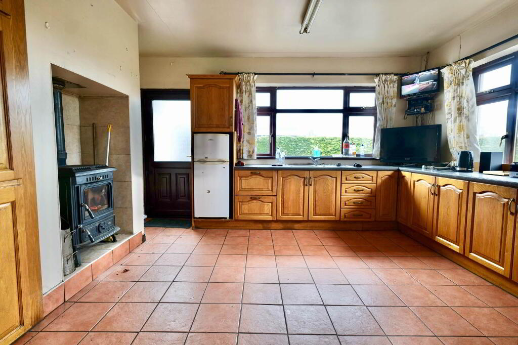 Kitchen - 13'2" (4.01m) x 14'8" (4.47m) Tiled floor, fitted kitchen and solid fuel stove with back boiler