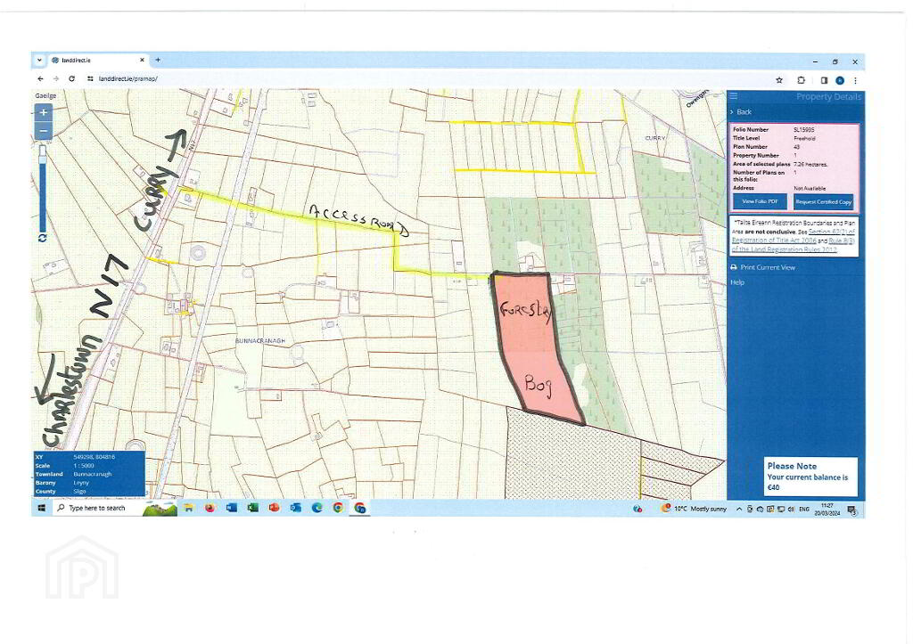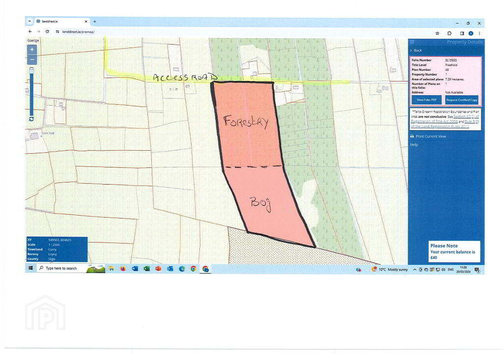 This is located along quiet country road approx. 1 mile off the N17 (Sligo - Galway Road) and within 3 miles of local town of Charlestown.  The entire property is contained in folio SL15935.  The property comprise of approx. 9.5 acres of semi-mature Sitka Spruce forestry which was planted in 2001 (some replanted 10 years later) and also approx. 8.4 acres of Bog located at rear of the forestry.