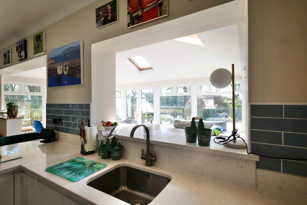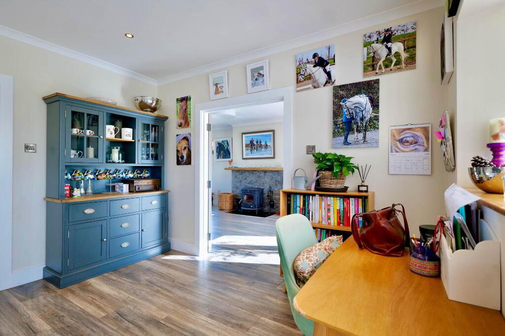 A large sitting room with a solid fuel stove and patio doors to the rear provides an excellent additional family space, with French doors connecting back to the kitchen/dining area.