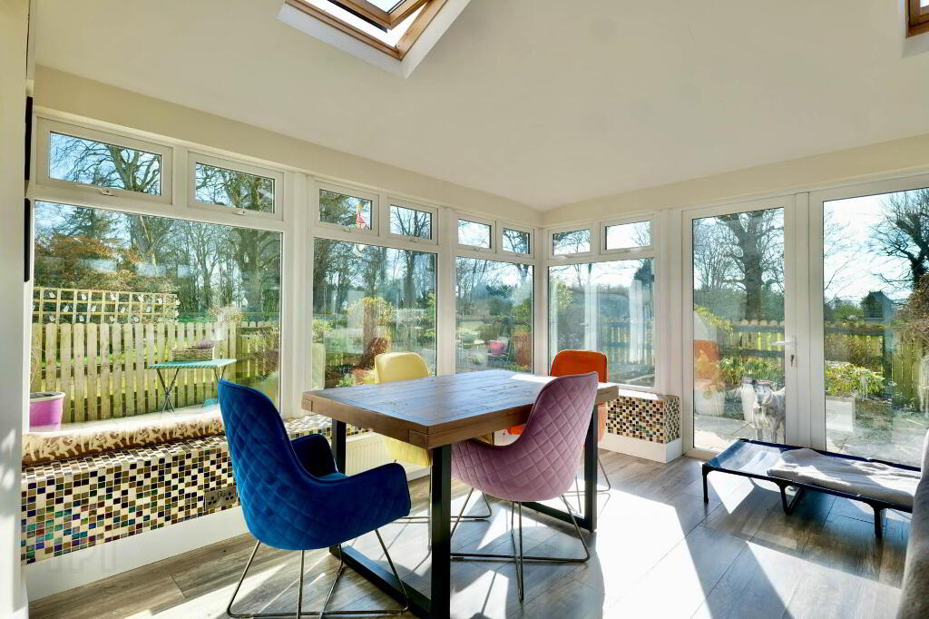 This space flows seamlessly into a sunroom with Velux windows, offering a light-filled area ideal for relaxing or entertaining while overlooking the gardens.