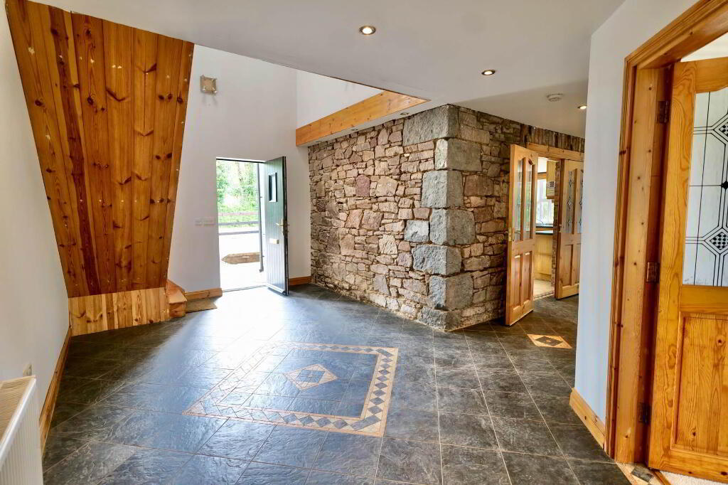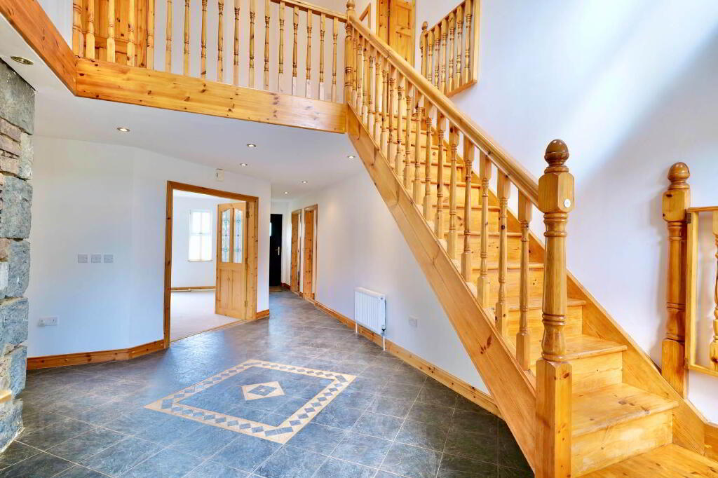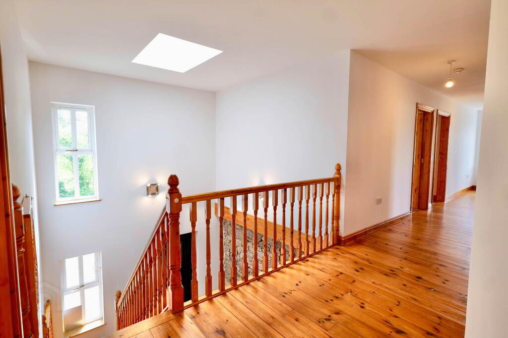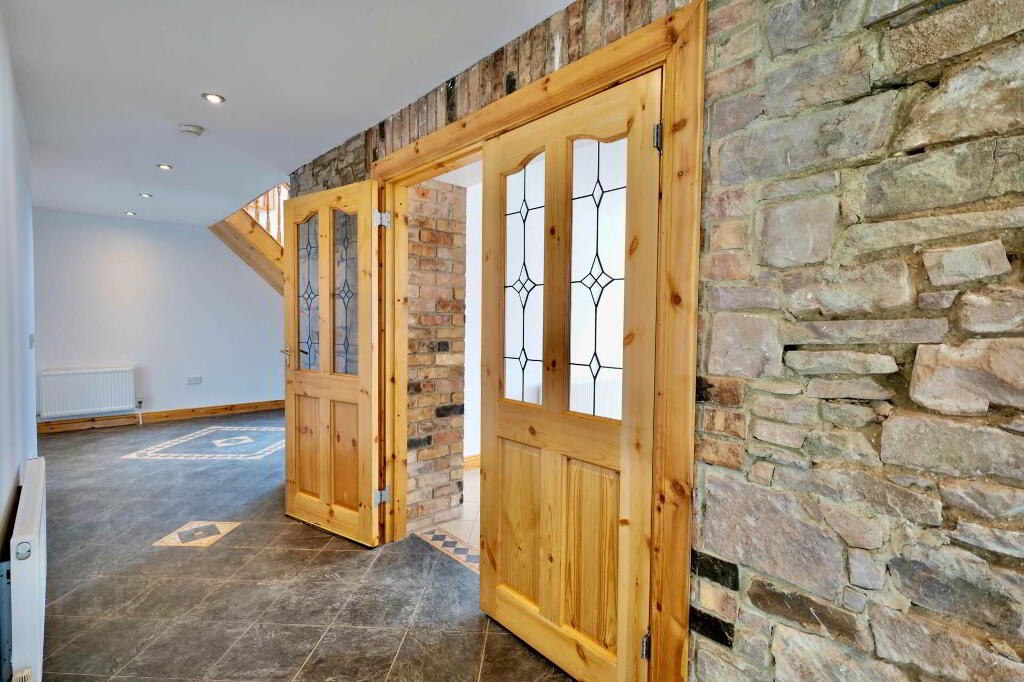 Once you step over the threshold, you are welcomed by a spacious entrance hallway with a vaulted ceiling and the original stone wall of the existing cottage, which is a lovely feature. This area is tiled and there are stairs rising to the first floor. Double doors bring you into the sitting room which has an open fireplace with timber surround, carpet flooring and double doors out to the garden where you can enjoy the lovely views of the surrounding countryside and beyond. Through to the kitchen/dining area, there is an extensive hand-crafted kitchen fitted, complete with integrated appliances, display cabinets and island finished in stone. Just down the corridor from the kitchen is a utility room which is fully plumbed and has built-in units and sink area. There is also a guest WC and a bedroom/home office at ground floor level.