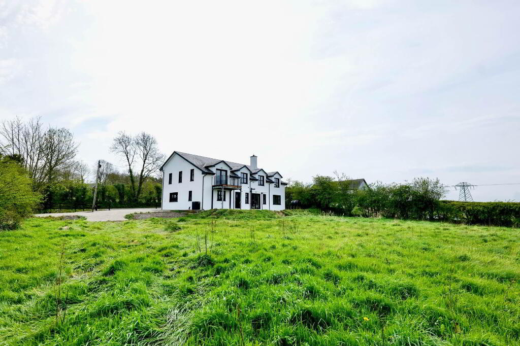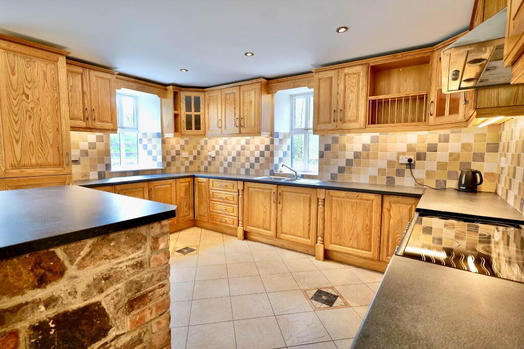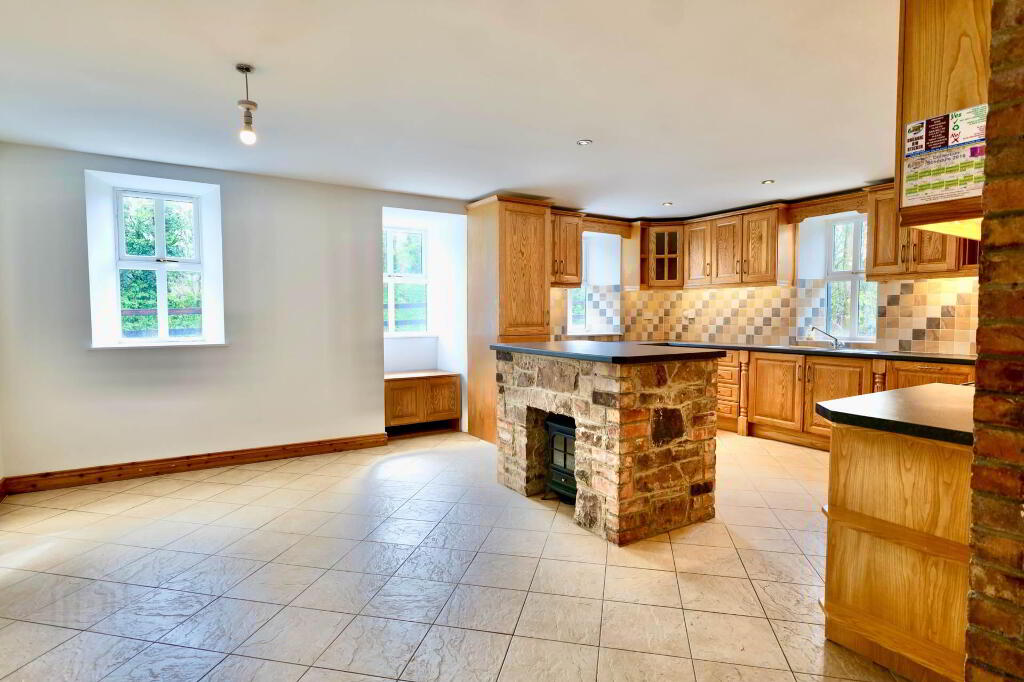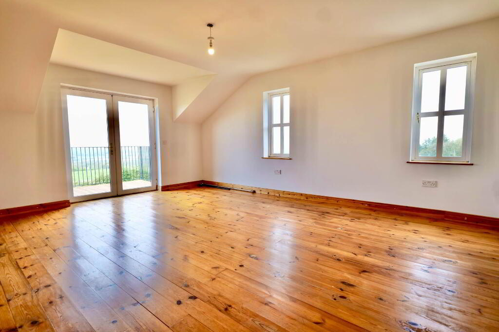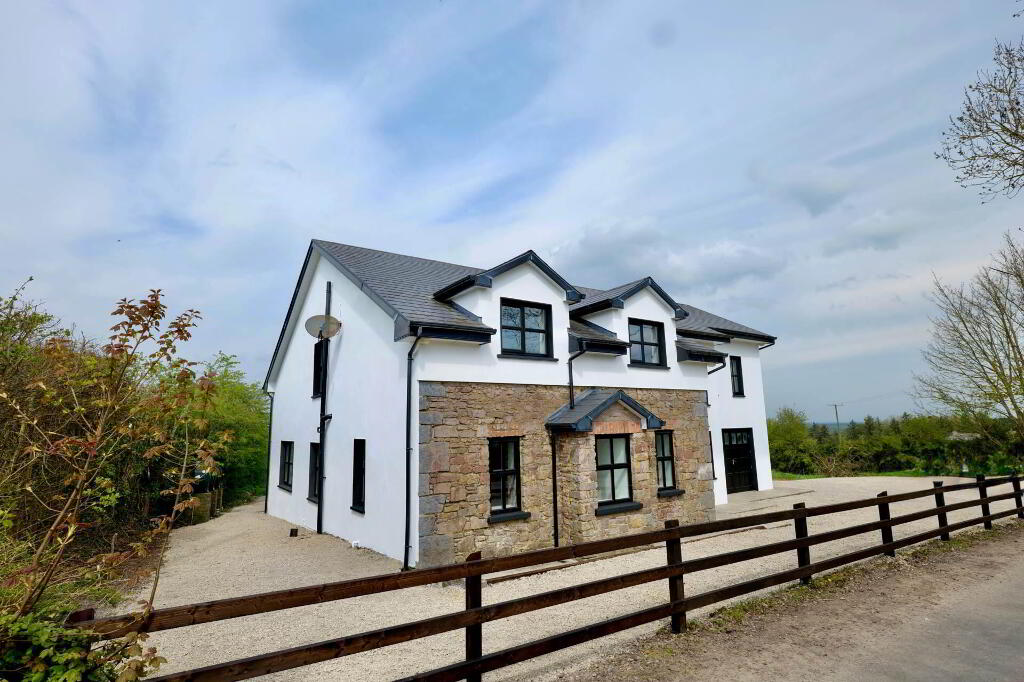Once you step over the threshold, you are welcomed by a spacious entrance hallway with a vaulted ceiling and the original stone wall of the existing cottage, which is a lovely feature. This area is tiled and there are stairs rising to the first floor. Double doors bring you into the sitting room which has an open fireplace with timber surround, carpet flooring and double doors out to the garden where you can enjoy the lovely views of the surrounding countryside and beyond. Through to the kitchen/dining area, there is an extensive hand-crafted kitchen fitted, complete with integrated appliances, display cabinets and island finished in stone. Just down the corridor from the kitchen is a utility room which is fully plumbed and has built-in units and sink area. There is also a guest WC and a bedroom/home office at ground floor level.