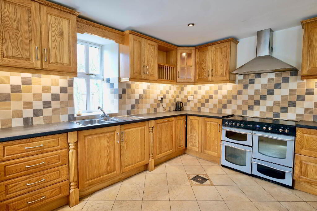 6.45m x 4.40m Entered via double French doors from hallway, hand-crafted fitted kitchen with display cabinets, integrated appliances, tiled splash back, power points, inlaid lighting, breakfast island with stone finish, extractor hood, Leisure freestanding double electric oven & hob, radiator, tiled floor, window seat