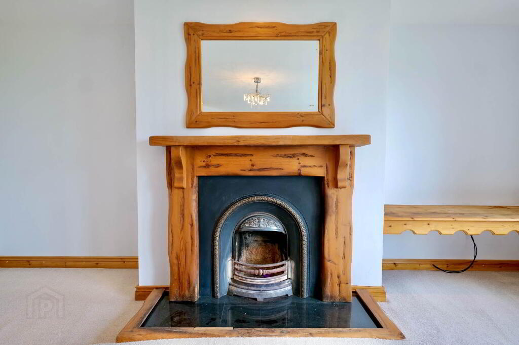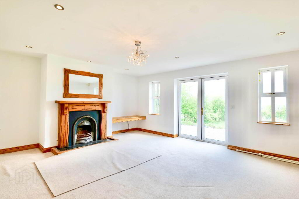 5.70m x 5.28m Accessed via double French doors from hallway, open fireplace, carpet, inlaid lighting, power points, TV point, radiator, double patio doors to rear garden