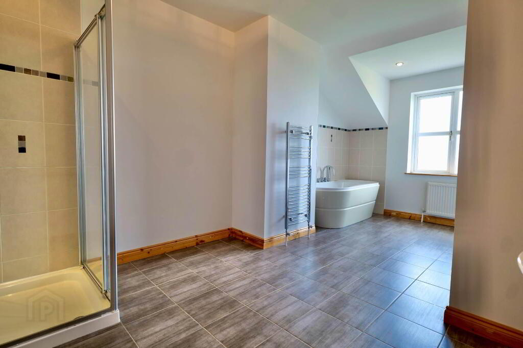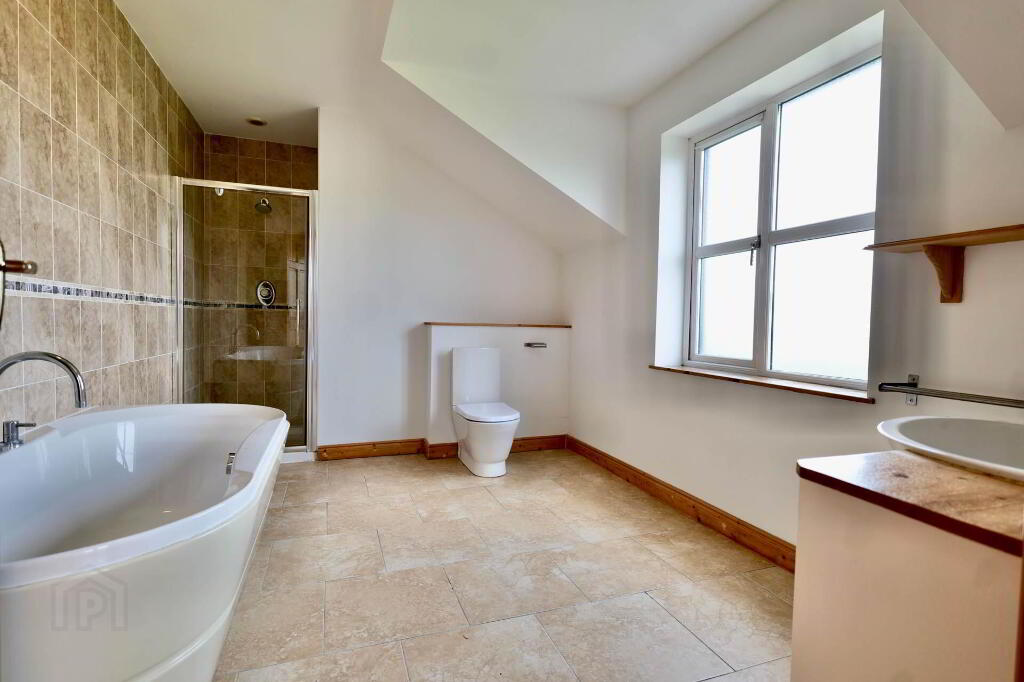 5.55m x 3.06m Tiled floor, WC, WHB, bath and separate shower unit, towel rail, radiator, inlaid lighting, pump shower