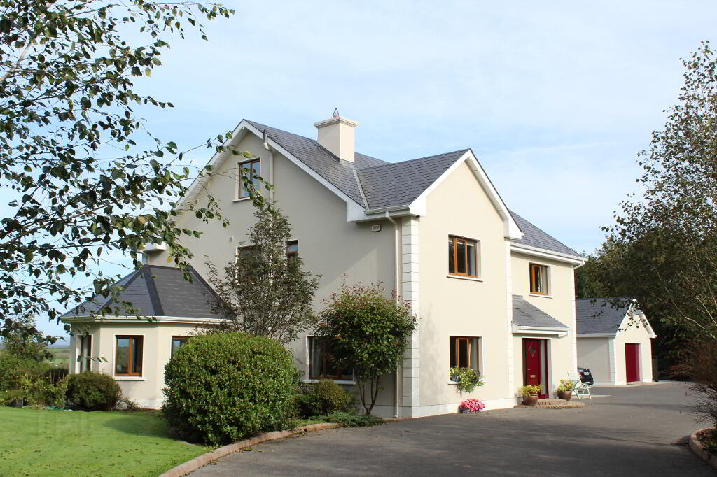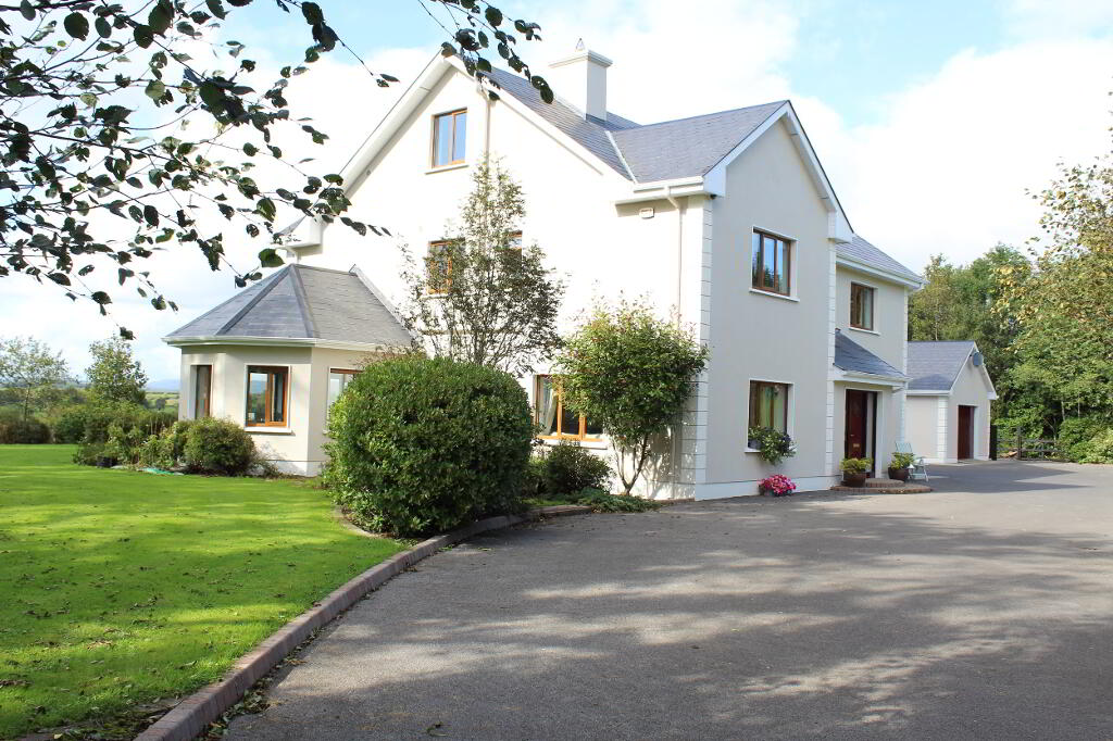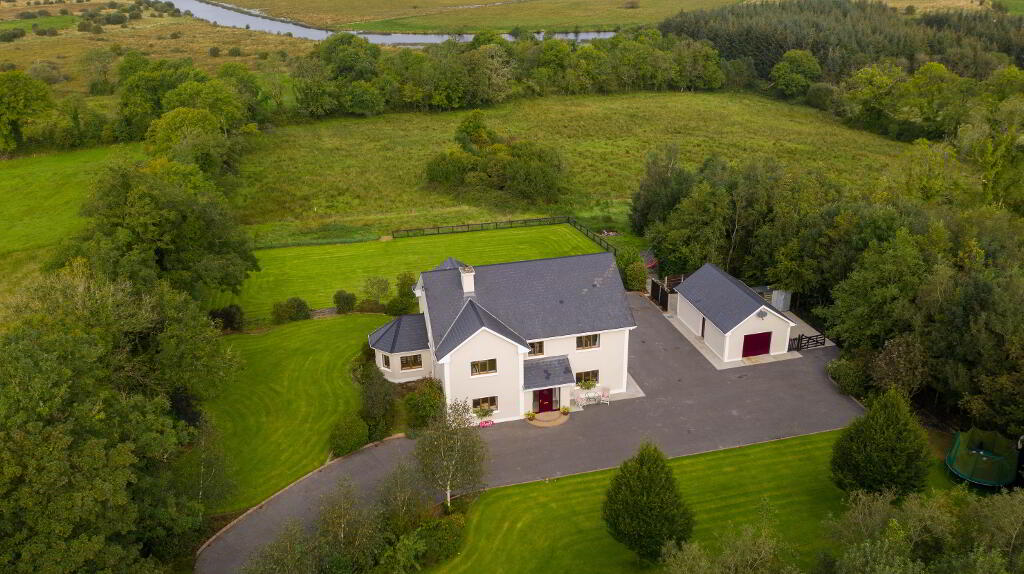 Seldom does a home with so much to offer come to the market. Situated on c.3.7 acres on elevated ground with panoramic views over the River Shannon this c.3350 Sq. Ft, 6 Bedroom home has everything. On arriving at the property, you are immediately impressed by the Tree Lined Drive and the gracious approach to the residence. The gardens are tastefully landscaped and the native woodland which is part of the property provides privacy on two sides. On entering the foyer, the scale is immediately apparent. The main living areas are to the rear of the property overlooking the massive back garden and enjoying great views of the Shannon Valley below. This area includes a large bespoke kitchen with granite countertops and attractive cabinetry. Continuing from that is a very large living space overlooking the patio and a dining area to the southern end. Also, on the ground floor is a formal living room & large home office-study off the foyer, a large utility room, WC and spacious ensuite bedroom. On the first floor are four more very large bedrooms, three with ensuites, two with walk in wardrobes, a house bathroom and a walk in hot-press. On the second floor is another large bedroom, house bathroom, walk in closet, Home Gym-Living room and bathroom. In addition, there is a very large detached garage with loft and enclosed side yard adjoining, great for the hobbyist or the boating enthusiast who needs storage. To the rear the deck overlooks a great rear garden ideally set up for the kids field sports. This residence is located c. 3km from the centre of Carrick on Shannon between Carrick on Shannon and Leitrim Village beside the new Blueway route. This is a very well-regarded neighbourhood. It enjoys a right of way to the river allowing access for your own boat. This is an exceptional listing. Houses of this size and quality in this highly desired location are not frequently listed.