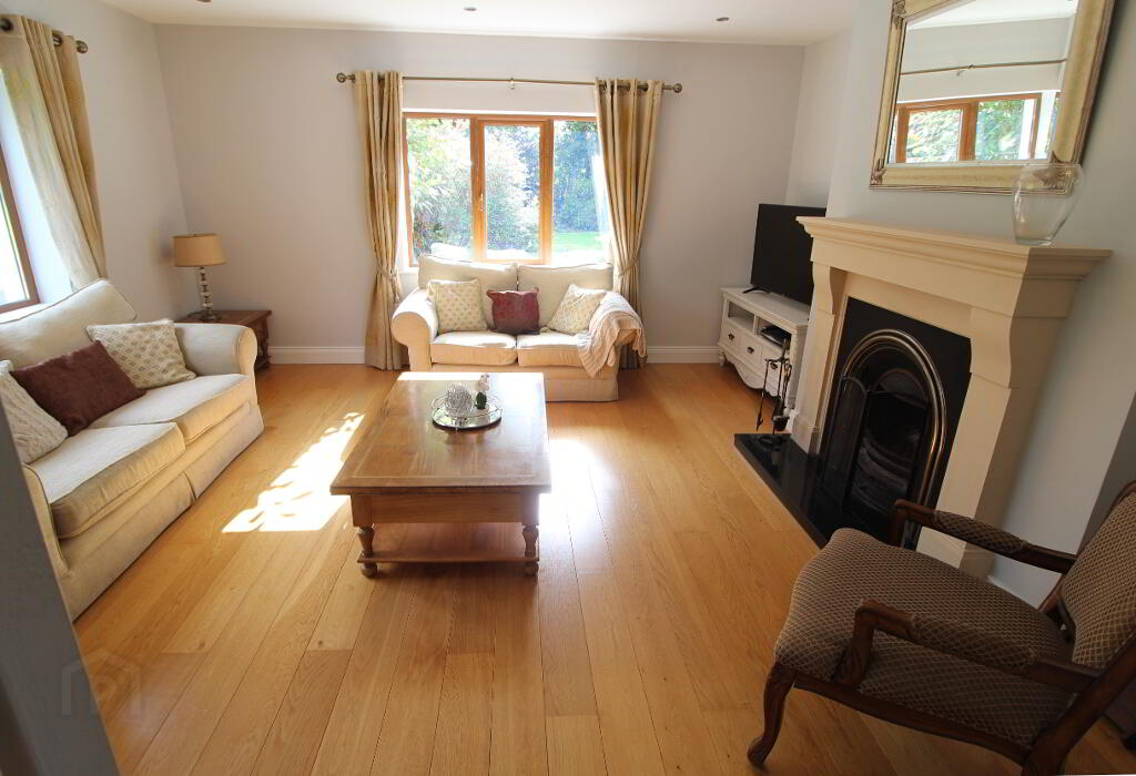Spacious living area to the front of the house with solid oak flooring, open fireplace with stone and granite surround, recessed lights, window to front and side, power points and tv point.