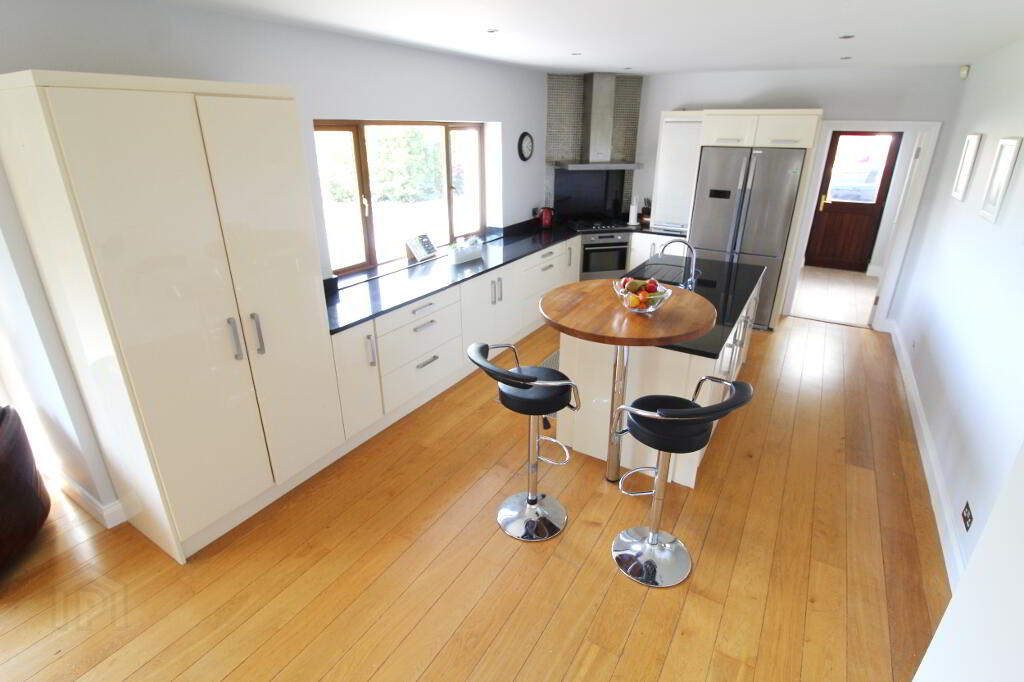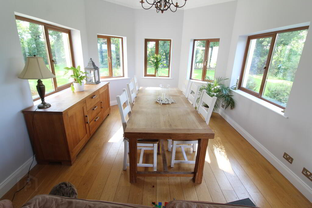 Spacious kitchen dining and living area at rear of house which is filled with light and is an ideal space for dining and entertaining, cream fitted kitchen with granite worktops and island in the middle with sink and dishwasher, tiled flooring built in fridge freezer, gas hob and oven, recessed lighting, patio doors leading to decking and gardens at rear with views over the majestic River Shannon. Dining area and living area has high wooden ceiling and numerous windows allowing lots of light.